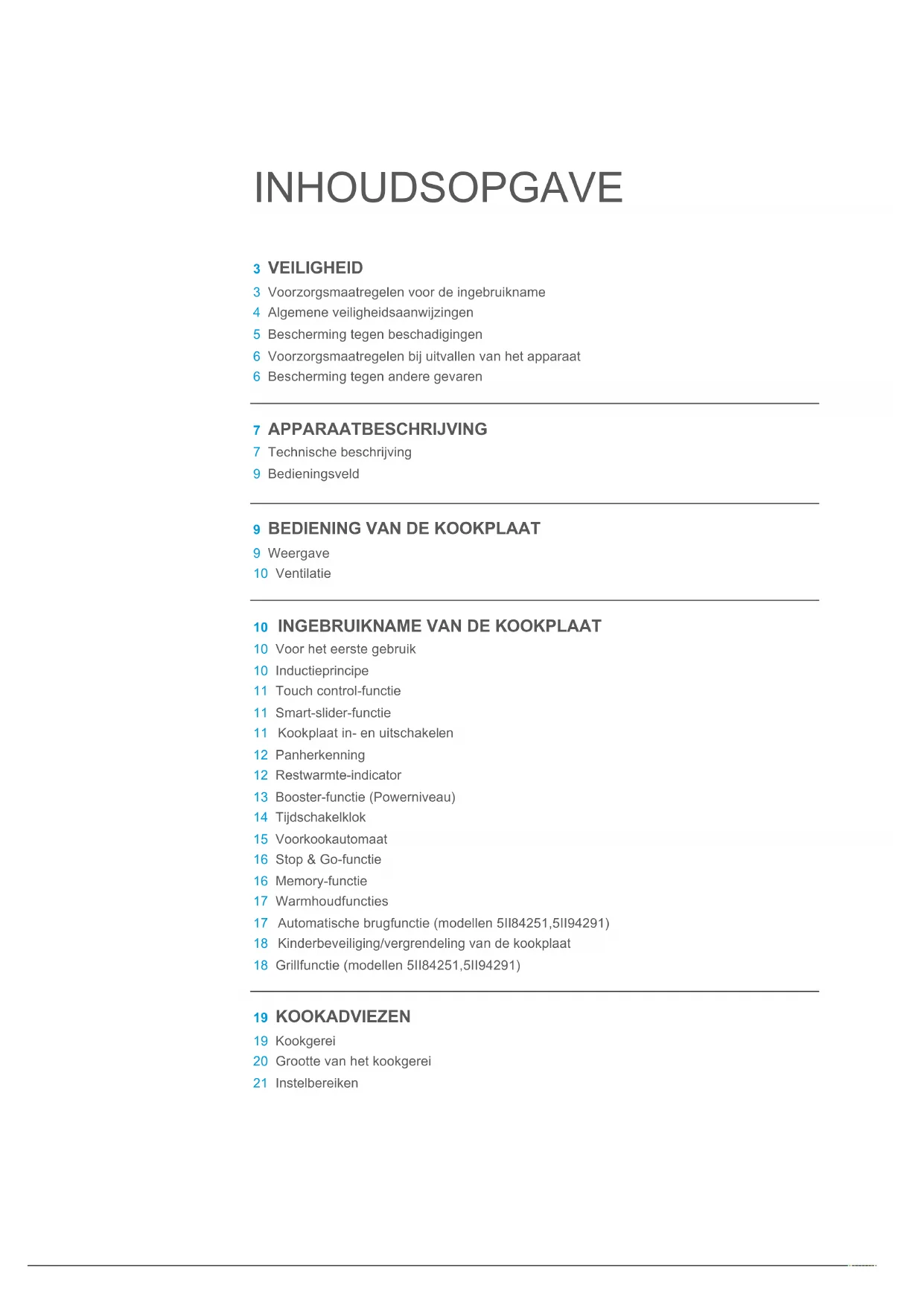 10 Voor het eerste gebruik 10 Inductieprincipe 11 Touch control-functie 11 Smart-slider-functie 11 Kookplaat in- en uitschakelen 12 Panherkenning 12 Restwarmte-indicator 13 Booster-functie (Powerniveau) 14 Tijdschakelklok 15 Voorkookautomaat 16 Stop & Go-functie 16 Memory-functie 17 Warmhoudfuncties 17 Automatische brugfunctie (modellen 5II84251,5II94291) 18 Kinderbeveiliging/vergrendeling van de kookplaat 18 Grillfunctie (modellen 5II84251,5II94291) 19 KOOKADVIEZEN 19 Kookgerei 20 Grootte van het kookgerei 21 Instelbereiken21 INGEBRUIKNAME VAN DE KAP (NIET VOOR 5IZ34291) 21 Blaupunkt Multi Control – unieke verbinding tussen kookplaat en kap 22 Kapverlichting in- of uitschakelen 22 Beheermodus voor de kap selecteren 23 Ventilatievermogen instellen 23 Booster-functie 24 Standaard snelheidsinstelling in de halfautomatische modus 24 Ventilatie-timer