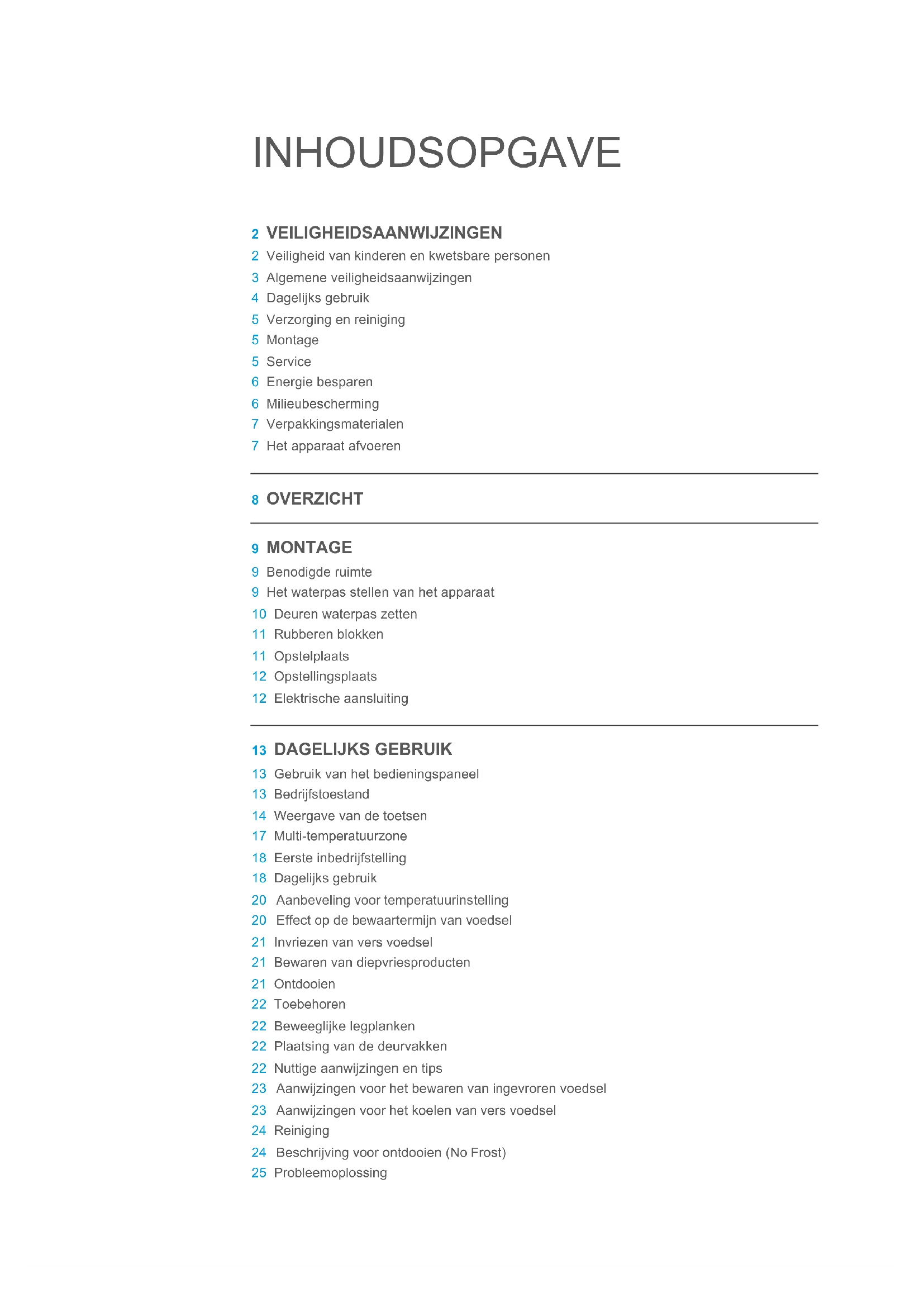 2 VEILIGHEIDSAANWIJZINGEN 2 Veiligheid van kinderen en kwetsbare personen 3 Algemene veiligheidsaanwijzingen 4 Dagelijks gebruik 5 Verzorging en reiniging 5 Montage 5 Service 6 Energie besparen 6 Milieubescherming 7 Verpakkingsmaterialen 7 Het apparaat afvoeren 8 OVERZICHT 9 MONTAGE 9 Benodigde ruimte 9 Het waterpas stellen van het apparaat 10 Deuren waterpas zetten 11 Rubberen blokken 11 Opstelplaats 12 Opstellingsplaats 12 Elektrische aansluiting 13 DAGELIJKS GEBRUIK 13 Gebruik van het bedieningspaneel 13 Bedrijfstoestand 14 Weergave van de toetsen 17 Multi-temperatuurzone 18 Eerste inbedrijfstelling 18 Dagelijks gebruik 20 Aanbeveling voor temperatuurinstelling 20 Effect op de bewaartermijn van voedsel 21 Invriezen van vers voedsel 21 Bewaren van diepvriesproducten 21 Ontdooien 22 Toebehoren 22 Beweeglijke legplanken 22 Plaatsing van de deurvakken 22 Nuttige aanwijzingen en tips 23 Aanwijzingen voor het bewaren van ingevroren voedsel 23 Aanwijzingen voor het koelen van vers voedsel 24 Reiniging 24 Beschrijving voor ontdooien (No Frost) 25 Probleemoplossing2 VEILIGHEIDSAANWIJZINGEN Lees voorafgaand aan de installatie en het eerste gebruik van het toestel voor uw veiligheid en ter waarborging van een correct gebruik deze gebruiksaanwijzing met inbegrip van de aanwijzingen en waarschuwingen, zorgvuldig door. Ter voorkoming van onnodige fouten en ongelukken is het van belang dat iedereen die het apparaat gebruikt, zich volledig vertrouwd heeft gemaakt met de bediening en de veiligheidsaspecten ervan. Bewaar deze gebruiksaanwijzing en zorg ervoor dat deze bij het apparaat blijft als het wordt verplaatst of verkocht, zodat iedereen die het apparaat tijdens de levensduur ervan gebruikt voldoende is geïnformeerd over het gebruik en de veiligheid ervan. Volg ter bescherming van leven en eigendommen de aanwijzingen in deze gebruiksaanwijzing op, aangezien de fabrikant niet aansprakelijk is voor schade die door het niet naleven ervan wordt veroorzaakt. Veiligheid van kinderen en kwetsbare personen