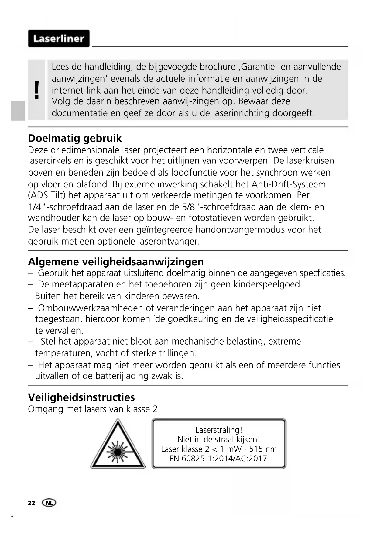 - at max. 300 lux EU and UK directives and disposal This device complies with all necessary standards for the free movement of goods within the EU and the UK. This product, including accessories and packaging, is an electrical appliance that must be recycled in an environmentally appropriate manner in accordance with European and UK directives on waste electrical and electronic equipment, batteries and packaging, in order to recover valuable raw materials. Further safety and supplementary notices at: https://www.laserliner.com Technical data (Subject to technical changes without notice. 23W04) Self-levelling range ± 3.5° (horizontal) Accuracy ± 0.2 mm / m Levelling automatic Visibility (typical)* 55 m Working range with hand receiver 60 m (depends on how the technology affects the difference in brightness) Laser wavelength 515 nm Laser class 2 / < 1 mW (EN 60825-1:2014/AC:2017) Degree of protection IP 64 Power supply Li-ion battery pack 7.4V / 2.6Ah / 19.24Wh Power pack 5V/DC / 2A Tripod connection 1/4" thread Operating time with 3 laser levels: approx. 5 hours with 2 laser levels: approx. 10 hours with 1 laser level: approx. 17 hours Charging time approx. 4 hours Operating conditions 0°C ... 50°C, max. humidity 80% rH,no condensation, max. working altitude 4000 m above sea level Storage conditions -10°C ... 70°C, max. humidity 80% rH Dimensions (W x H x D) 140 x 130 x 85 mm Weight 636 g (incl. battery pack) EN22 Laserstraling! Niet in de straal kijken! Laser klasse 2 < 1 mW · 515 nm EN 60825-1:2014/AC:2017 Veiligheidsinstructies Omgang met lasers van klasse 2 Algemene veiligheidsaanwijzingen – Gebruik het apparaat uitsluitend doelmatig binnen de aangegeven speccaties. – De meetapparaten en het toebehoren zijn geen kinderspeelgoed. Buiten het bereik van kinderen bewaren. – Ombouwwerkzaamheden of veranderingen aan het apparaat zijn niet toegestaan, hierdoor komen ´de goedkeuring en de veiligheidsspecicatie te vervallen. – Stel het apparaat niet bloot aan mechanische belasting, extreme temperaturen, vocht of sterke trillingen. – Het apparaat mag niet meer worden gebruikt als een of meerdere functies uitvallen of de batterijlading zwak is. Lees de handleiding, de bijgevoegde brochure ‚Garantie- en aanvullende aanwijzingen‘ evenals de actuele informatie en aanwijzingen in de internet-link aan het einde van deze handleiding volledig door. Volg de daarin beschreven aanwij-zingen op. Bewaar deze documentatie en geef ze door als u de laserinrichting doorgeeft.