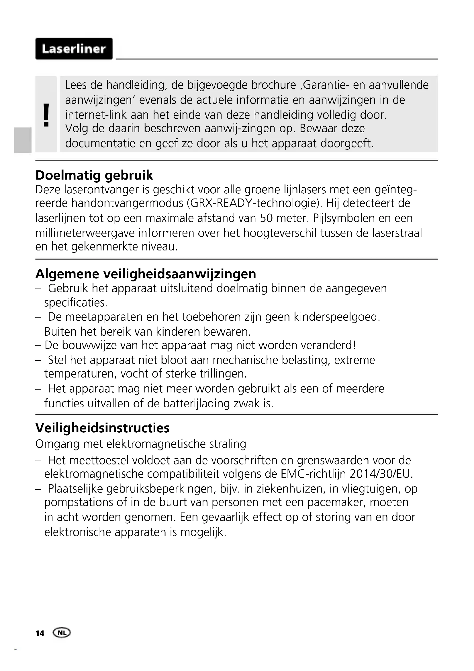 Doelmatig gebruik Deze laserontvanger is geschikt voor alle groene lijnlasers met een geïnteg- reerde handontvangermodus (GRX-READY-technologie). Hij detecteert de laserlijnen tot op een maximale afstand van 50 meter. Pijlsymbolen en een millimeterweergave informeren over het hoogteverschil tussen de laserstraal en het gekenmerkte niveau. – Het meettoestel voldoet aan de voorschriften en grenswaarden voor de elektromagnetische compatibiliteit volgens de EMC-richtlijn 2014/30/EU. – Plaatselijke gebruiksbeperkingen, bijv. in ziekenhuizen, in vliegtuigen, op pompstations of in de buurt van personen met een pacemaker, moeten in acht worden genomen. Een gevaarlijk effect op of storing van en door elektronische apparaten is mogelijk. Veiligheidsinstructies Omgang met elektromagnetische straling Algemene veiligheidsaanwijzingen – Gebruik het apparaat uitsluitend doelmatig binnen de aangegeven specicaties. – De meetapparaten en het toebehoren zijn geen kinderspeelgoed. Buiten het bereik van kinderen bewaren. – De bouwwijze van het apparaat mag niet worden veranderd! – Stel het apparaat niet bloot aan mechanische belasting, extreme temperaturen, vocht of sterke trillingen. – Het apparaat mag niet meer worden gebruikt als een of meerdere functies uitvallen of de batterijlading zwak is. NLRangeXtender M 50