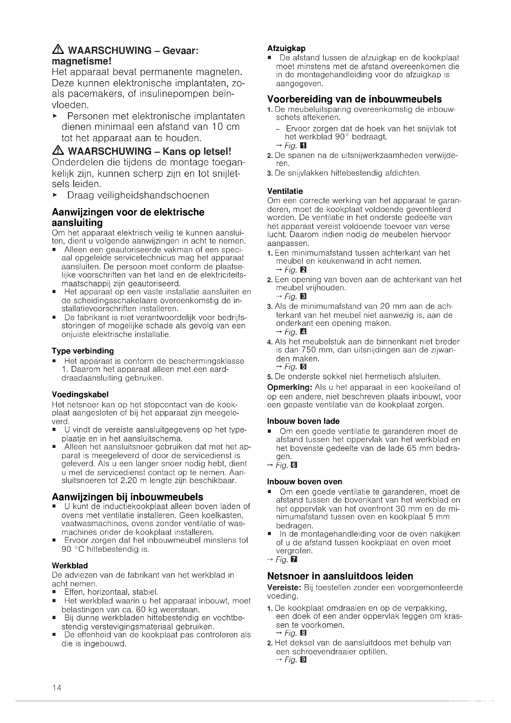 draadaansluiting gebruiken. Voedingskabel Het netsnoer kan op het stopcontact van de kook- plaat aangesloten of bij het apparaat zijn meegele- verd. ¡ U vindt de vereiste aansluitgegevens op het type- plaatje en in het aansluitschema. ¡ Alleen het aansluitsnoer gebruiken dat met het ap- parat is meegeleverd of door de servicedienst is geleverd. Als u een langer snoer nodig hebt, dient u met de servicedienst contact op te nemen. Aan- sluitsnoeren tot 2,20 m lengte zijn beschikbaar. Aanwijzingen bij inbouwmeubels ¡ U kunt de inductiekookplaat alleen boven laden of ovens met ventilatie installeren. Geen koelkasten, vaatwasmachines, ovens zonder ventilatie of was- machines onder de kookplaat installeren. ¡ Ervoor zorgen dat het inbouwmeubel minstens tot 90 °C hittebestendig is. Werkblad De adviezen van de fabrikant van het werkblad in acht nemen. ¡ Effen, horizontaal, stabiel. ¡ Het werkblad waarin u het apparaat inbouwt, moet belastingen van ca. 60 kg weerstaan. ¡ Bij dunne werkbladen hittebestendig en vochtbe- stendig verstevigingsmateriaal gebruiken. ¡ De effenheid van de kookplaat pas controleren als die is ingebouwd. Afzuigkap ¡ De afstand tussen de afzuigkap en de kookplaat moet minstens met de afstand overeenkomen die in de montagehandleiding voor de afzuigkap is aangegeven. Voorbereiding van de inbouwmeubels