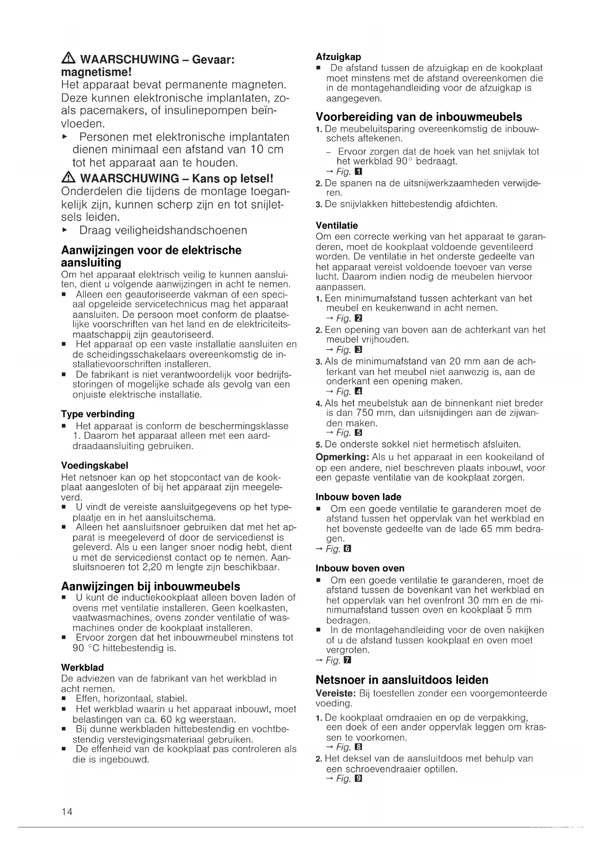 draadaansluiting gebruiken. Voedingskabel Het netsnoer kan op het stopcontact van de kook- plaat aangesloten of bij het apparaat zijn meegele- verd. ¡ U vindt de vereiste aansluitgegevens op het type- plaatje en in het aansluitschema. ¡ Alleen het aansluitsnoer gebruiken dat met het ap- parat is meegeleverd of door de servicedienst is geleverd. Als u een langer snoer nodig hebt, dient u met de servicedienst contact op te nemen. Aan- sluitsnoeren tot 2,20 m lengte zijn beschikbaar. Aanwijzingen bij inbouwmeubels ¡ U kunt de inductiekookplaat alleen boven laden of ovens met ventilatie installeren. Geen koelkasten, vaatwasmachines, ovens zonder ventilatie of was- machines onder de kookplaat installeren. ¡ Ervoor zorgen dat het inbouwmeubel minstens tot 90 °C hittebestendig is. Werkblad De adviezen van de fabrikant van het werkblad in acht nemen. ¡ Effen, horizontaal, stabiel. ¡ Het werkblad waarin u het apparaat inbouwt, moet belastingen van ca. 60 kg weerstaan. ¡ Bij dunne werkbladen hittebestendig en vochtbe- stendig verstevigingsmateriaal gebruiken. ¡ De effenheid van de kookplaat pas controleren als die is ingebouwd. Afzuigkap ¡ De afstand tussen de afzuigkap en de kookplaat moet minstens met de afstand overeenkomen die in de montagehandleiding voor de afzuigkap is aangegeven. Voorbereiding van de inbouwmeubels