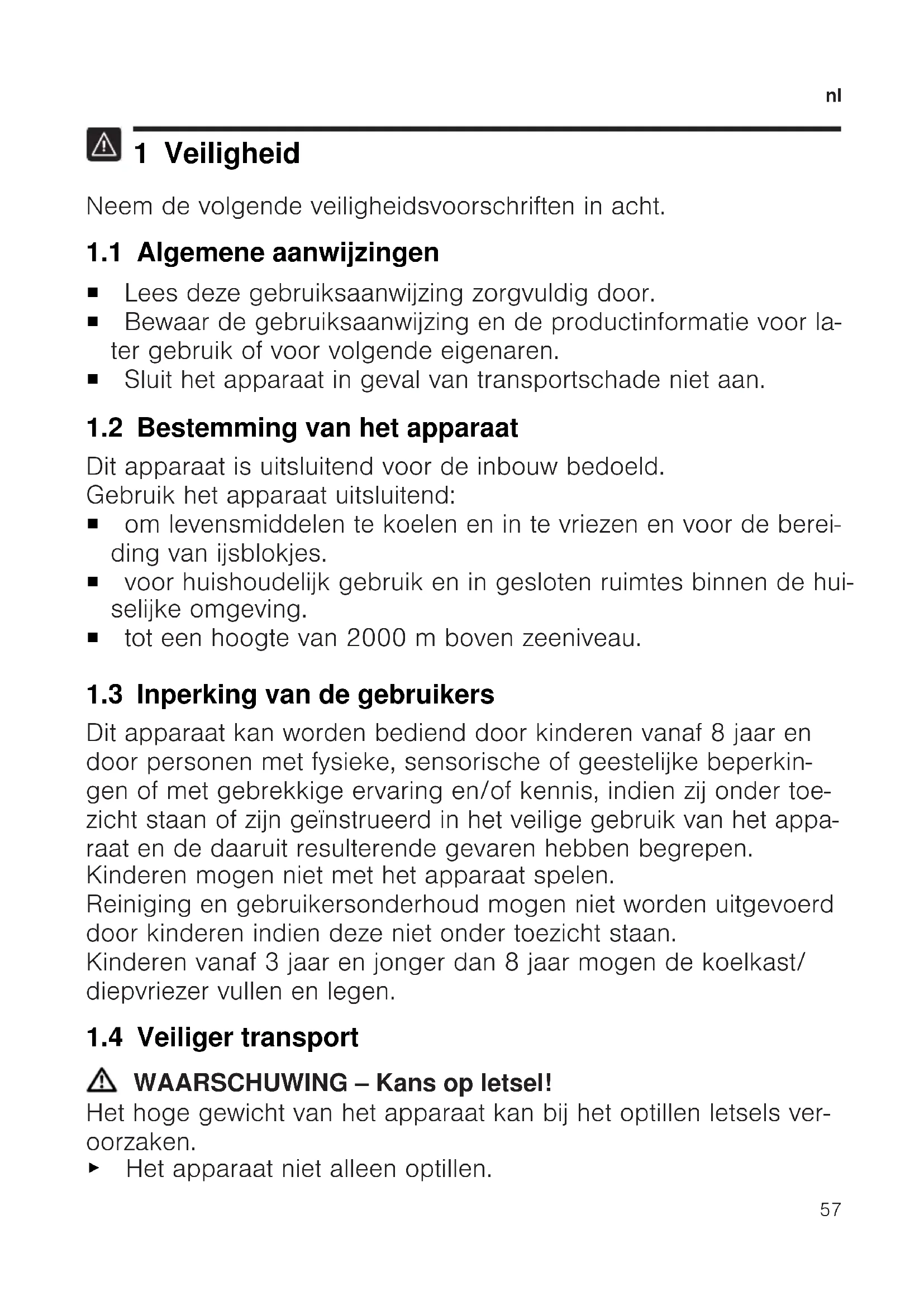 1 Veiligheid Neem de volgende veiligheidsvoorschriften in acht. 1.1 Algemene aanwijzingen ¡ Lees deze gebruiksaanwijzing zorgvuldig door. ¡ Bewaar de gebruiksaanwijzing en de productinformatie voor la- ter gebruik of voor volgende eigenaren. ¡ Sluit het apparaat in geval van transportschade niet aan. 1.2 Bestemming van het apparaat Dit apparaat is uitsluitend voor de inbouw bedoeld. Gebruik het apparaat uitsluitend: ¡ om levensmiddelen te koelen en in te vriezen en voor de berei- ding van ijsblokjes. ¡ voor huishoudelijk gebruik en in gesloten ruimtes binnen de hui- selijke omgeving. ¡ tot een hoogte van 2000m boven zeeniveau. 1.3 Inperking van de gebruikers Dit apparaat kan worden bediend door kinderen vanaf 8 jaar en door personen met fysieke, sensorische of geestelijke beperkin- gen of met gebrekkige ervaring en/of kennis, indien zij onder toe- zicht staan of zijn geïnstrueerd in het veilige gebruik van het appa- raat en de daaruit resulterende gevaren hebben begrepen. Kinderen mogen niet met het apparaat spelen. Reiniging en gebruikersonderhoud mogen niet worden uitgevoerd door kinderen indien deze niet onder toezicht staan. Kinderen vanaf 3 jaar en jonger dan 8 jaar mogen de koelkast/ diepvriezer vullen en legen. 1.4 Veiliger transport WAARSCHUWING‒Kans op letsel! Het hoge gewicht van het apparaat kan bij het optillen letsels ver- oorzaken. ▶ Het apparaat niet alleen optillen.nl