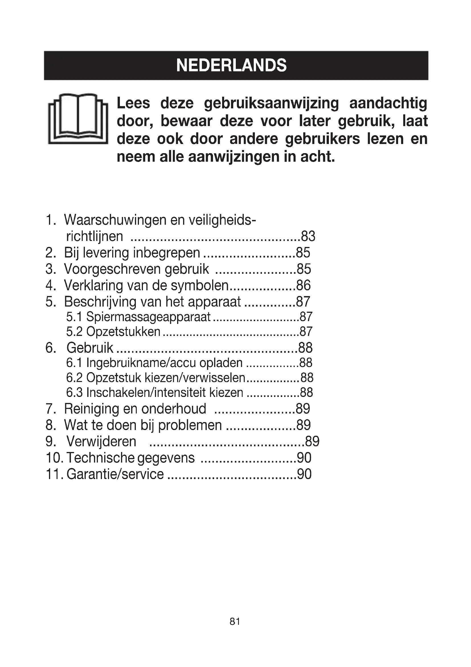 EN VEILIGHEIDS- RICHTLIJNEN WAARSCHUWING Gebruik het apparaat niet bij door ziekte ver- oorzaakte veranderingen of wonden op het te masseren deel van het lichaam (bijvoor