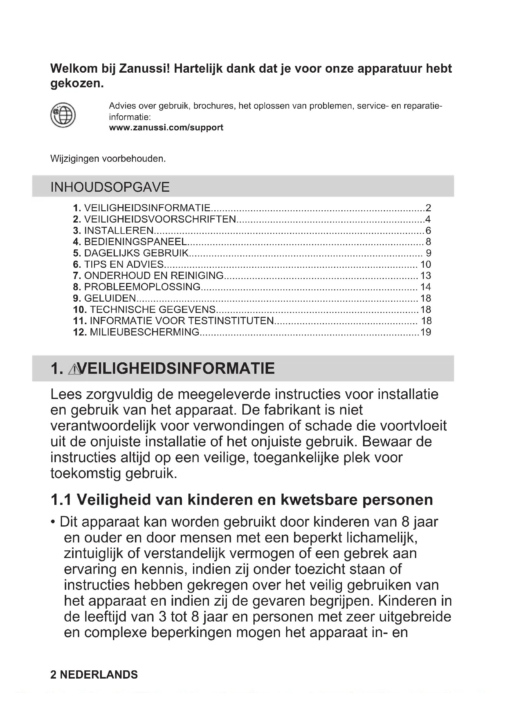 Recycleer de materialen met het symbool . Gooi de verpakking in een geschikte afvalcontainer om het te recycleren. Bescherm het milieu en de volksgezondheid en recycleer op een correcte manier het afval van elektrische en elektronische apparaten. Gooi apparaten gemarkeerd met het symbool niet weg met het huishoudelijk afval. Breng het product naar het milieustation bij u in de buurt of neem contact op met de gemeente. NEDERLANDS 19Bienvenue chez Zanussi ! Nous vous remercions d’avoir choisi l’un de nos appareils. Obtenir des conseils d’utilisation, des brochures, un dépanneur, des informations surle service et les réparations :www.zanussi.com/supportSous réserve de modifications.