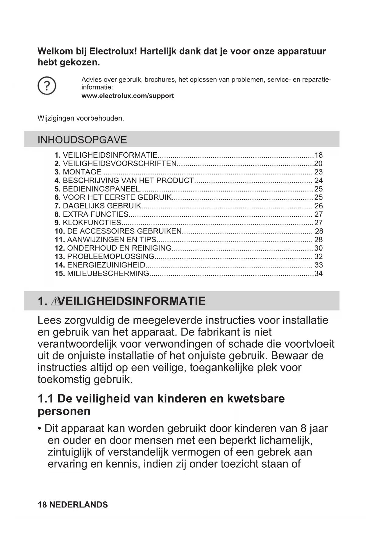 Recycleer de materialen met het symbool . Gooi de verpakking in een geschikte afvalcontainer om het te recycleren. Bescherm het milieu en de volksgezondheid en recycleer op een correcte manier het afval van elektrische en elektronische apparaten. Gooi apparaten gemarkeerd met het symbool niet weg met het huishoudelijk afval. Breng het product naar het milieustation bij u in de buurt of neem contact op met de gemeente. 34 NEDERLANDSWelcome to Electrolux! Thank you for choosing our appliance. Get usage advice, brochures, trouble shooter, service and repair information:www.electrolux.com/supportSubject to change without notice. CONTENTS