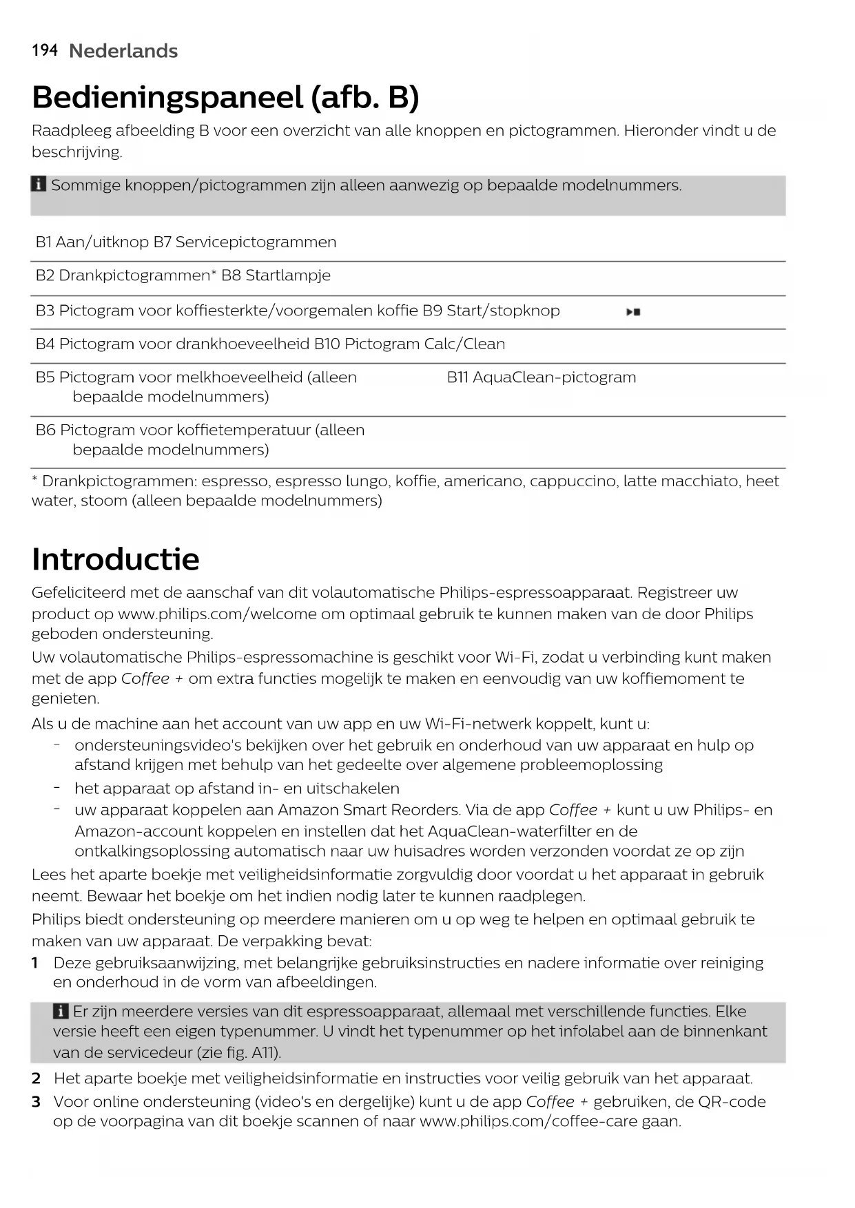 uw apparaat koppelen aan Amazon Smart Reorders. Via de app Coffee + kunt u uw Philips- en Amazon-account koppelen en instellen dat het AquaClean-waterfilter en de ontkalkingsoplossing automatisch naar uw huisadres worden verzonden voordat ze op zijn Lees het aparte boekje met veiligheidsinformatie zorgvuldig door voordat u het apparaat in gebruik neemt. Bewaar het boekje om het indien nodig later te kunnen raadplegen. Philips biedt ondersteuning op meerdere manieren om u op weg te helpen en optimaal gebruik te maken van uw apparaat. De verpakking bevat: 1 Deze gebruiksaanwijzing, met belangrijke gebruiksinstructies en nadere informatie over reiniging en onderhoud in de vorm van afbeeldingen. Er zijn meerdere versies van dit espressoapparaat, allemaal met verschillende functies. Elke versie heeft een eigen typenummer. U vindt het typenummer op het infolabel aan de binnenkant van de servicedeur (zie fig. A11). 2 Het aparte boekje met veiligheidsinformatie en instructies voor veilig gebruik van het apparaat. 3 Voor online ondersteuning (video's en dergelijke) kunt u de app Coffee + gebruiken, de QR-code op de voorpagina van dit boekje scannen of naar www.philips.com/coffee-care gaan.195 Nederlands Nederlands Dit apparaat is getest met koffie. Hoewel het apparaat zorgvuldig is schoongemaakt, kunnen er wat koffieresten zijn achtergebleven. We garanderen dat het apparaat helemaal nieuw is. Het apparaat past automatisch de hoeveelheid gemalen koffie aan die wordt gebruikt, om de lekkerste koffie te maken. Na de eerste vijf koppen koffie is het apparaat helemaal goed ingesteld. Spoel de LatteGo (melkreservoir) of de klassieke melkopschuimer af voor het eerste gebruik. Vóór het eerste gebruik