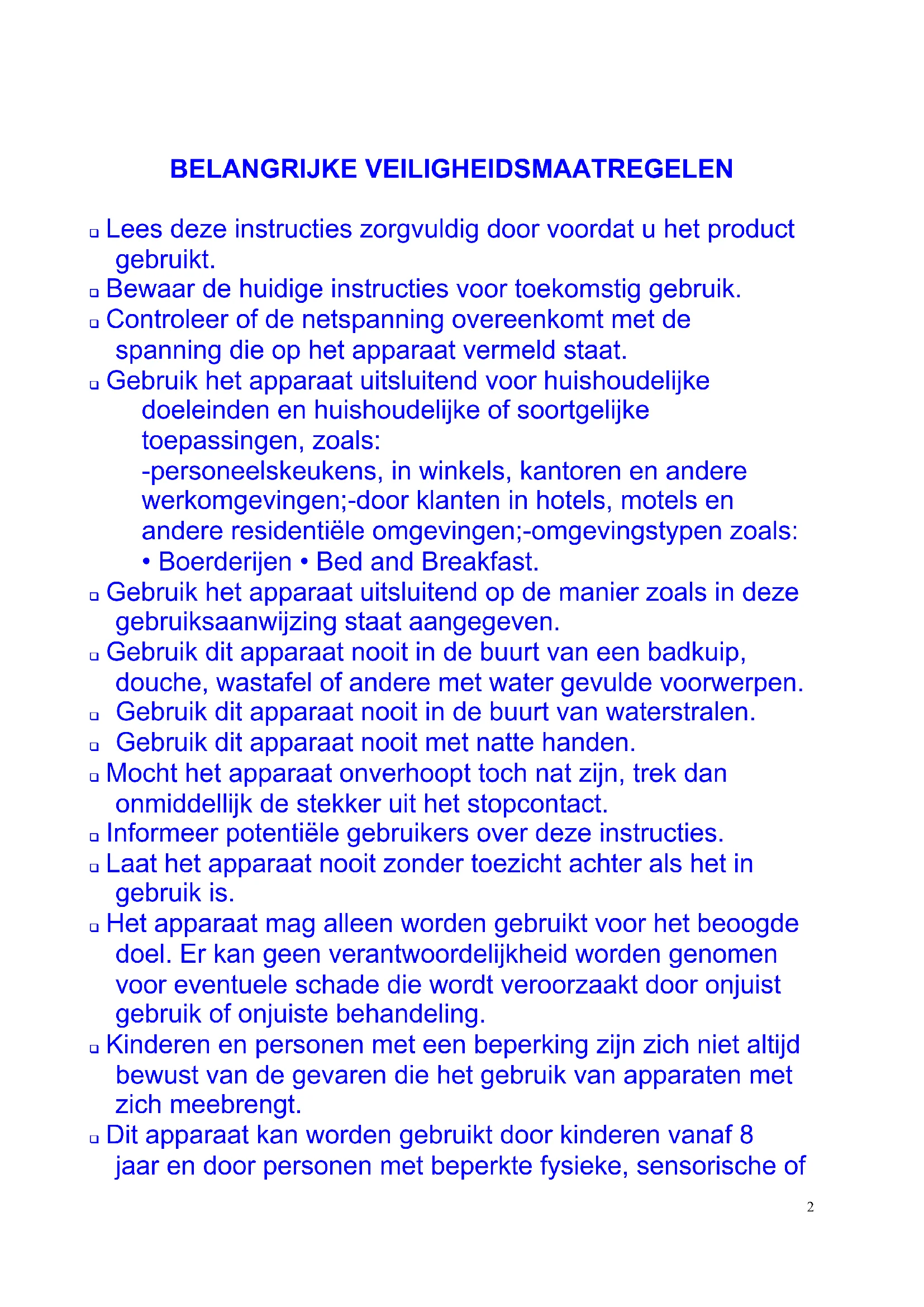 - Boerderijen • Bed and Breakfast. q Gebruik het apparaat uitsluitend op de manier zoals in deze gebruiksaanwijzing staat aangegeven. q Gebruik dit apparaat nooit in de buurt van een badkuip, douche, wastafel of andere met water gevulde voorwerpen. q Gebruik dit apparaat nooit in de buurt van waterstralen. q Gebruik dit apparaat nooit met natte handen. q Mocht het apparaat onverhoopt toch nat zijn, trek dan onmiddellijk de stekker uit het stopcontact. q Informeer potentiële gebruikers over deze instructies. q Laat het apparaat nooit zonder toezicht achter als het in gebruik is. q Het apparaat mag alleen worden gebruikt voor het beoogde doel. Er kan geen verantwoordelijkheid worden genomen voor eventuele schade die wordt veroorzaakt door onjuist gebruik of onjuiste behandeling. q Kinderen en personen met een beperking zijn zich niet altijd bewust van de gevaren die het gebruik van apparaten met zich meebrengt. q Dit apparaat kan worden gebruikt door kinderen vanaf 8 jaar en door personen met beperkte fysieke, sensorische of3 mentale vermogens of met een gebrek aan ervaring en kennis, mits zij onder toezicht staan of instructies hebben gekregen over het veilige gebruik van het apparaat en zij de gevaren begrijpen die hiermee gepaard gaan. q Kinderen mogen niet met het apparaat spelen. Reiniging en gebruikersonderhoud mogen niet door kinderen worden uitgevoerd , tenzij ze ouder zijn dan 8 en onder toezicht staan. q Houd het apparaat en het snoer buiten bereik van kinderen jonger dan 8 jaar. q Om de veiligheid van uw kinderen te garanderen , dient u alle verpakkingen (plastic zakken, dozen, piepschuim etc.) buiten hun bereik te houden. q Let op! Laat kleine kinderen niet met de folie spelen: ER IS VERSTIKKINGSGEVAAR ! q Controleer het snoer van tijd tot tijd op schade. Gebruik het apparaat nooit als het snoer of het apparaat tekenen van schade vertoont. q Dompel het apparaat nooit onder in water of een andere vloeistof, om welke reden dan ook. q Doe het nooit in de vaatwasser. q Gebruik het apparaat nooit in de buurt van hete oppervlakken. q Als het netsnoer beschadigd is, moet het worden vervangen door de fabrikant, diens servicevertegenwoordiger of een soortgelijke bevoegde persoon