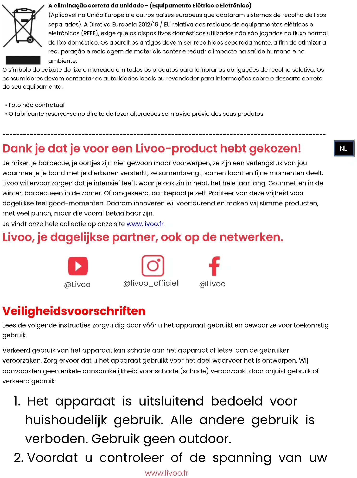 Dank je dat je voor een Livoo-product hebt gekozen! Je mixer, je barbecue, je oortjes zijn niet gewoon maar voorwerpen, ze zijn een verlengstuk van jou waarmee je je band met je dierbaren versterkt, ze samenbrengt, samen lacht en fijne momenten deelt. Livoo wil ervoor zorgen dat je intensief leeft, waar je ook zin in hebt, het hele jaar lang. Gourmetten in de winter, barbecueën in de zomer. Of omgekeerd, dat bepaal je zelf. Profiteer van deze vrijheid voor dagelijkse feel good-momenten. Daarom innoveren wij voortdurend en maken wij slimme producten, met veel punch, maar die vooral betaalbaar zijn. Je vindt onze hele collectie op onze site www.livoo.fr Livoo, je dagelijkse partner, ook op de netwerken.