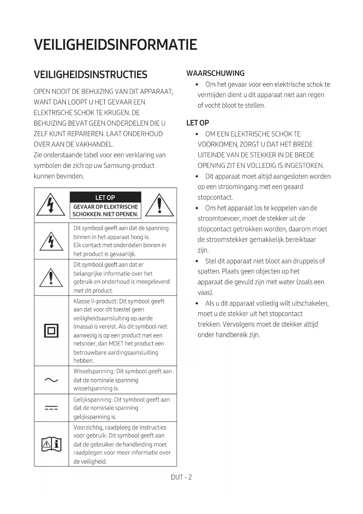 OVER AAN DE VAKHANDEL. Zie onderstaande tabel voor een verklaring van symbolen die zich op uw Samsung-product kunnen bevinden. LET OP GEVAAR OP ELEKTRISCHE SCHOKKEN. NIET OPENEN.Dit symbool geeft aan dat de spanning binnen in het apparaat hoog is. Elk contact met onderdelen binnen in het product is gevaarlijk.Dit symbool geeft aan dat er belangrijke informatie over het gebruik en onderhoud is meegeleverd met dit product.Klasse II-product: Dit symbool geeft aan dat voor dit toestel geen veiligheidsaansluiting op aarde (massa) is vereist. Als dit symbool niet aanwezig is op een product met een netsnoer, dan MOET het product een betrouwbare aardingsaansluiting hebben.Wisselspanning: Dit symbool geeft aan dat de nominale spanning wisselspanning is.Gelijkspanning: Dit symbool geeft aan dat de nominale spanning gelijkspanning is.Voorzichtig, raadpleeg de instructies voor gebruik: Dit symbool geeft aan dat de gebruiker de handleiding moet raadplegen voor meer informatie over de veiligheid. WAARSCHUWING