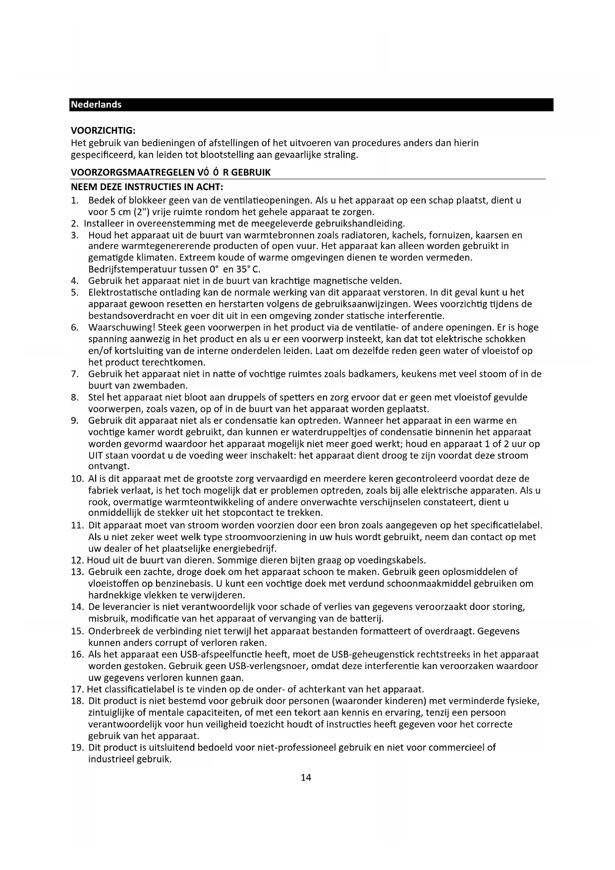 19. Dit product is uitsluitend bedoeld voor niet-professioneel gebruik en niet voor commercieel of