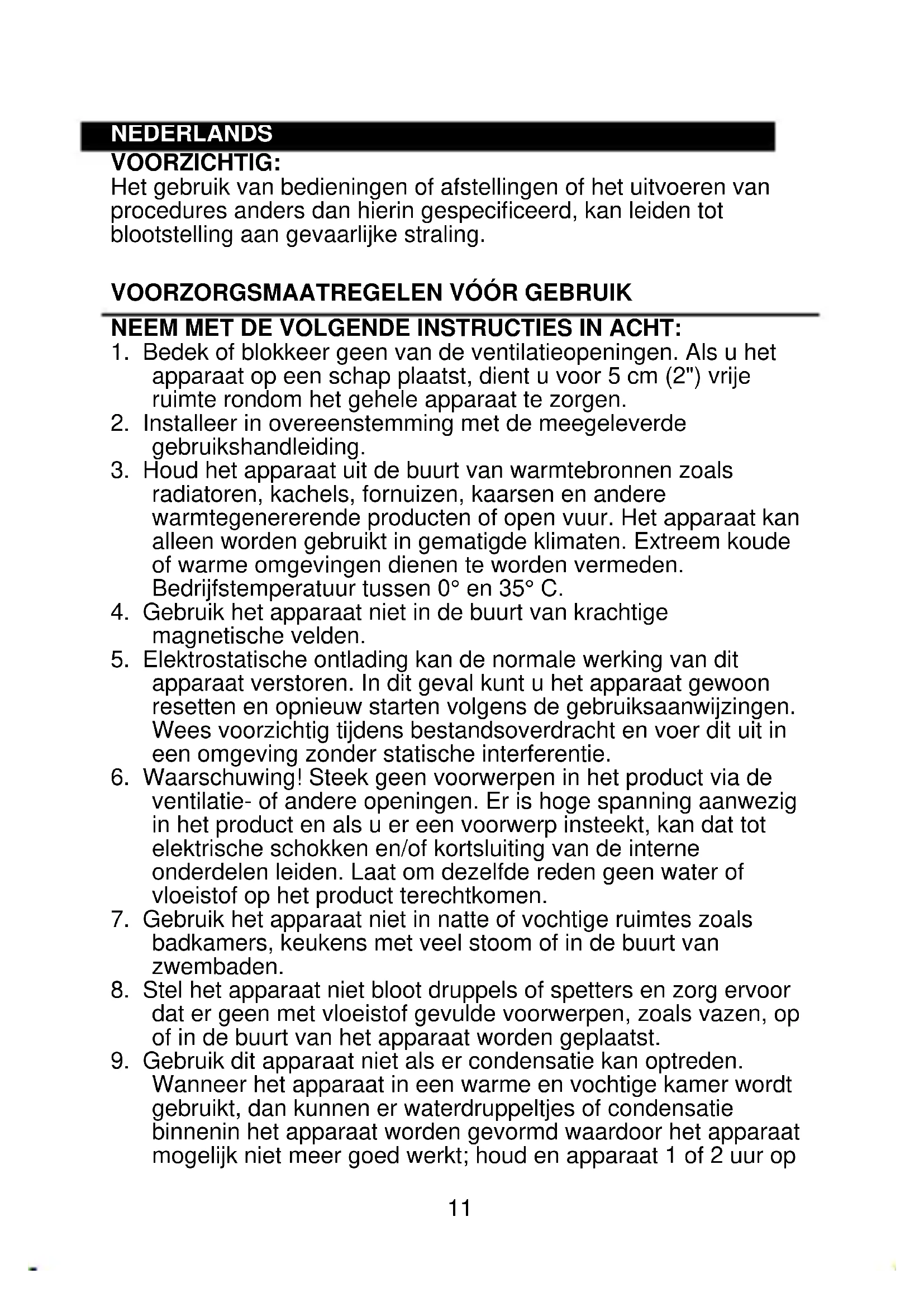 9. Gebruik dit apparaat niet als er condensatie kan optreden.