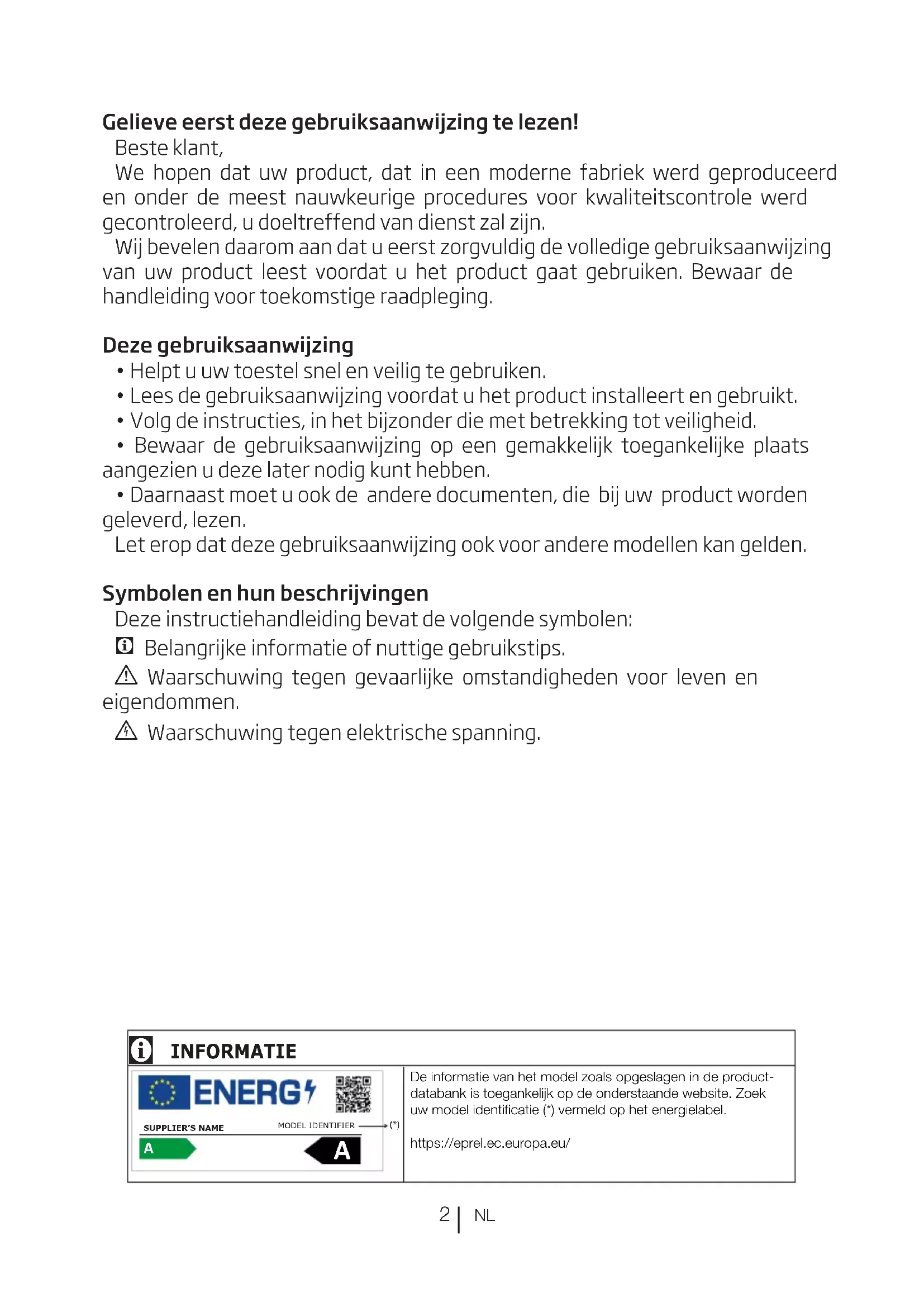 - Bewaar de gebruiksaanwijzing op een gemakkelijk toegankelijke plaats aangezien u deze later nodig kunt hebben.