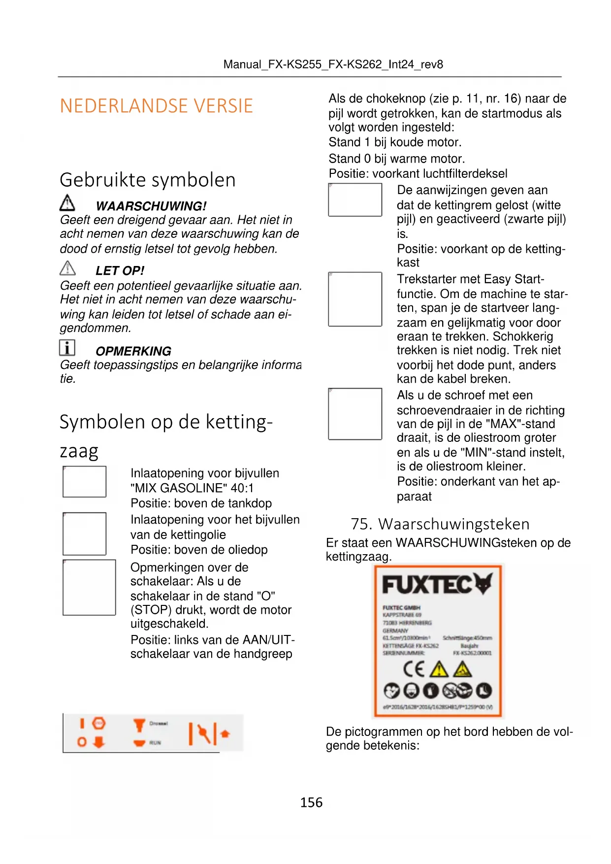 in het hout worden verankerd en daardoor als draaipunt worden gebruikt. ◼ Plaats de zaag altijd zo vlak mogelijk en dicht bij de klauwaanslag. Tegenslag en bijbehorende voor- zorgsmaatregelen Let op! De kettingzaag kan terugslaan: ◼ door de punt van de geleiderail met een vast voorwerp te raken, ◼ als het te zagen hout wordt samengedrukt en de geleiderail in de zaagsnede vast komt te zitten. Als de punt van de geleiderail in contact komt met een vast voorwerp, kan deze bliksemsnel terugspringen. De geleiderail kan naar achte- ren en omhoog in de richting van de gebrui- ker worden geslingerd. Als de zaagketting vastloopt op het bovenste deel van het zaagblad, kan deze met een snelle beweging naar achteren en naar de gebruiker worden geduwd. Als een van deze twee gebeurtenissen zich voordoet, kunt u de controle over de ketting- zaag verliezen. Dit kan leiden tot ernstig let- sel. Vertrouw daarom niet alleen op de inge- bouwde veiligheidsfuncties van uw ket- tingzaag. Als gebruiker van de kettingzaag moet u uw eigen voorzorgsmaatregelen nemen om ervoor te zorgen dat u alle werkzaam- heden met de zaag kunt uitvoeren zonder ongelukken of letsel. ◼ Houd de kettingzaag altijd met beide han- den vast als de motor draait. De rechter- hand op de achterste handgreep en de lin- kerhand op de voorste handgreep. Pak de handgrepen stevig vast met uw hele hand. Een stevige greep vermindert het effect van terugslag en helpt u het apparaat on- der controle te houden. ◼ Zorg ervoor dat uw werkgebied vrij is van obstakels. Zorg ervoor dat de punt van de geleiderail tijdens het zagen niet in contact komt met andere stammen, takken of obstakels. Dit kan een ongeluk veroor- zaken. ◼ Voer het snijproces altijd uit met een hoge motorsnelheid. ◼ Zorg voor een goede balans tijdens het knippen en strek je armen niet te ver naar voren. ◼ Knip niet boven schouderhoogte. ◼ Volg de instructies van de fabrikant bij het onderhouden en slijpen van de ketting. ◼ Als het zaagblad of de zaagketting moet worden vervangen, monteer dan alleen de door de fabrikant aanbevolen reserveon- derdelen. Verstikkingsgevaar door koolmono- xide! ◼ Laat de verbrandingsmotor alleen bui- tenshuis draaien. Explosie- en brandgevaar! Benzinedampen zijn explosief en benzine is licht ontvlambaar. ◼ Vul de tank met brandstof voordat u de motor start. Houd de tank gesloten wan- neer de motor loopt of nog warm is. ◼ Vul alleen brandstof bij als de motor is uit- geschakeld en afgekoeld. Vermijd open vuur, vonken en rook niet. Tank het appa- raat alleen buitenshuis bij. ◼ Start de motor niet als er brandstof is over- gelopen. Verwijder de kettingzaag uit het met brandstof vervuilde gebied en wacht tot de brandstofdampen zijn verdwenen. ◼ Houd de volgende onderdelen vrij van lek- kende olie of brandstof om brandgevaar te voorkomen: − Motor, − Uitlaat, − Benzinetank. Werkzekerheid ◼ Houd je werkplek schoon en goed ver- licht. Onopgeruimdheid of onverlichte werkplekken kunnen leiden tot ongeluk- ken. ◼ Werk niet met de kettingzaag in een ex- plosiegevaarlijke omgeving. Dit geldt met name voor locaties waar ontvlambare vloeistoffen, gassen of stof aanwezig zijn.Manual_FX-KS255_FX-KS262_Int24_rev8