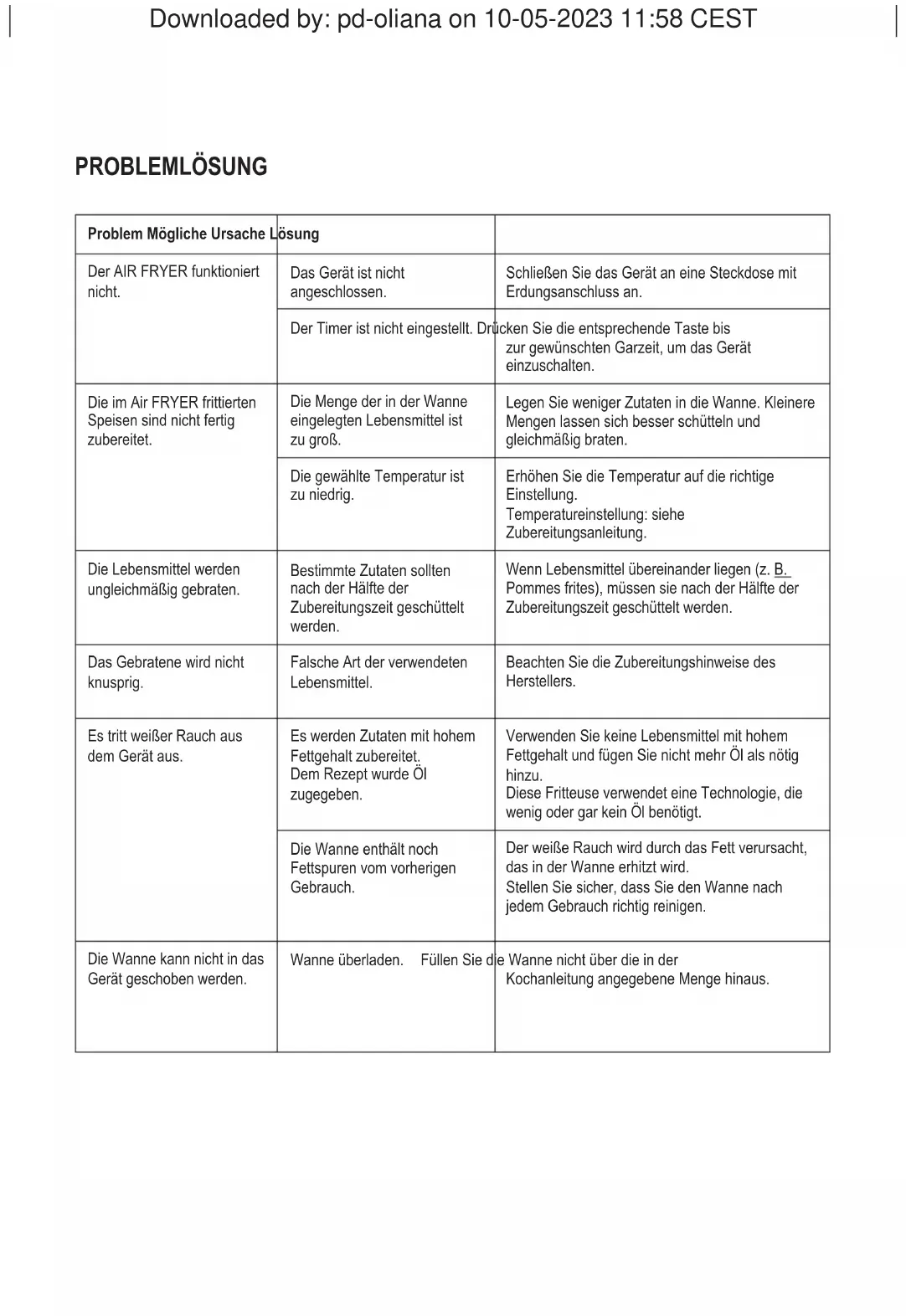 - Voedsel kan variëren in herkomst, grootte, vorm en merk, dus we kunnen niet de beste instellingen voor specieke voedingsmiddelen garanderen. KOOKGIDS Hoeveelheid voedsel (g) (min- max) Tijd (min) Temp. (°C) Schud Extra informatie Aardappelen en frietjes Dunne bevroren frietjes 300-1200 9-16 200 Ja Dikke bevroren frieten 300-1200 11-20 200 Ja Huisgemaakte frietjes (5×8mm) 300-1200 16-10 200 Ja Voeg 1/2 eetlepel olie toe Huisgemaakte aardappelpartjes 300-1200 18-22 180 Ja Voeg 1/2 eetlepel olie toe Huisgemaakte aardappelpartjes 300-1200 12-18 180 Ja Voeg 1/2 eetlepel olie toe Rosti 250 15-18 180 Ja Aardappelgratin 500 15-18 200 Ja Vlees en gevogelte Steak 100-500 8-12 180 Varkenskoteletten 100-500 10-14 180 Hamburger 100-500 7-14 180 Worstenbroodje 100-500 13-15 180 Trommelstokken 100-500 18-22 180 Kiplet 100-500 10-15 180 Snacks Lenterolletjes 100-400 8-10 200 Ja Ingevroren kipnuggets 100-500 6-10 200 Ja Bevroren vissticks 100-400 6-10 200 Bevroren gepaneerde kaassnacks 100-400 8-10 180 gevulde groenten 100-400 10 160 Bakken Downloaded by: pd-oliana on 10-05-2023 11:58 CESTTaart 300 20-25 160 Gebruik een bakvorm/ ovenschaal Quiche 400 20-22 180 Gebruik een bakvorm Mufns 300 15-18 200 Gebruik een bakvorm/ ovenschaal Zoete snacks 400 20 160 PROBLEEMOPLOSSING Probleem Mogelijke oorzaak oplossing De AIR FRYER werkt niet. Het apparaat is niet aangesloten. Steek de stekker in een geaard stopcontact. Je hebt de timer niet ingesteld. Druk op de betreffende knop tot de gewenste kooktijd om het apparaat in te schakelen. Het voedsel dat met de AIR FRYER is gebakken, is nog niet gaar. De hoeveelheid voedsel in de pot is te veel. Doe kleinere hoeveelheden voedsel in de pan. Kleinere porties worden gelijkmatiger gebakken. De ingestelde temperatuur is te laag. Druk op de temperatuurknoppen tot je de gewenste temperatuur hebt bereikt. Temperatuurinstelling - raadpleeg de kookgids voor meer informatie. Het eten wordt ongelijkmatig gebakken in de AIRFRYER. Bepaalde soorten voedsel moeten halverwege de kooktijd worden geschud. Voedsel dat op of tegenover elkaar ligt (bijvoorbeeld frietjes) moet halverwege de kooktijd worden geschud. Gefrituurde snacks zijn niet krokant als ze uit de AIR FRYER komen. Er is een verkeerde voedselsoort gebruikt. Raadpleeg de kookinstructies van voedselfabrikanten. Er komt witte rook uit het apparaat. Er is voedsel met een hoog oliegehalte gebruikt. Er is olie aan het voer toegevoegd. Gebruik geen voedselgroepen met een hoog oliegehalte en voeg geen extra olie toe die niet nodig is. Een heteluchtfriteuse maakt gebruik van technologie waarbij weinig of geen olie nodig is. De pot bevat nog vetresten van eerder gebruik. Witte rook wordt veroorzaakt door het opwarmen van vet in de pan. Zorg ervoor dat je de pot na elk gebruik goed schoonmaakt. Kan de lade niet in het apparaat schuiven. Pot overbelast. Vul de pan niet boven de in de kookgids vermelde indicatie. Downloaded by: pd-oliana on 10-05-2023 11:58 CESTRomâna (Translat din instrucțiunile originale)