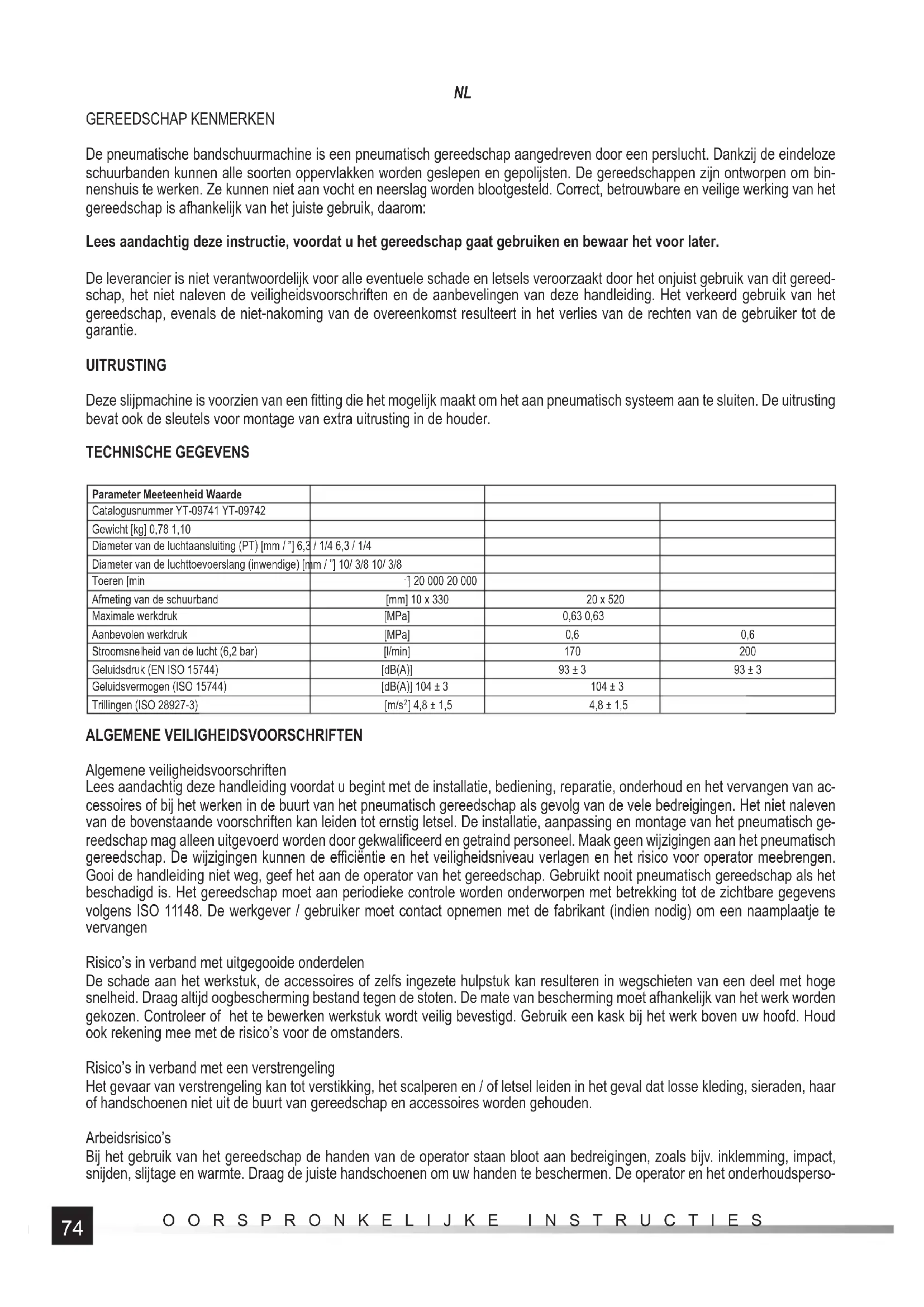 GEREEDSCHAP KENMERKEN De pneumatische bandschuurmachine is een pneumatisch gereedschap aangedreven door een perslucht. Dankzij de eindeloze schuurbanden kunnen alle soorten oppervlakken worden geslepen en gepolijsten. De gereedschappen zijn ontworpen om bin- nenshuis te werken. Ze kunnen niet aan vocht en neerslag worden blootgesteld. Correct, betrouwbare en veilige werking van het gereedschap is afhankelijk van het juiste gebruik, daarom: Lees aandachtig deze instructie, voordat u het gereedschap gaat gebruiken en bewaar het voor later. De leverancier is niet verantwoordelijk voor alle eventuele schade en letsels veroorzaakt door het onjuist gebruik van dit gereed- schap, het niet naleven de veiligheidsvoorschriften en de aanbevelingen van deze handleiding. Het verkeerd gebruik van het gereedschap, evenals de niet-nakoming van de overeenkomst resulteert in het verlies van de rechten van de gebruiker tot de garantie. UITRUSTING Deze slijpmachine is voorzien van een fi tting die het mogelijk maakt om het aan pneumatisch systeem aan te sluiten. De uitrusting bevat ook de sleutels voor montage van extra uitrusting in de houder. TECHNISCHE GEGEVENS Parameter Meeteenheid Waarde Catalogusnummer YT-09741 YT-09742 Gewicht [kg] 0,78 1,10 Diameter van de luchtaansluiting (PT) [mm / ”] 6,3 / 1/4 6,3 / 1/4 Diameter van de luchttoevoerslang (inwendige) [mm / ”] 10/ 3/8 10/ 3/8 Toeren [min