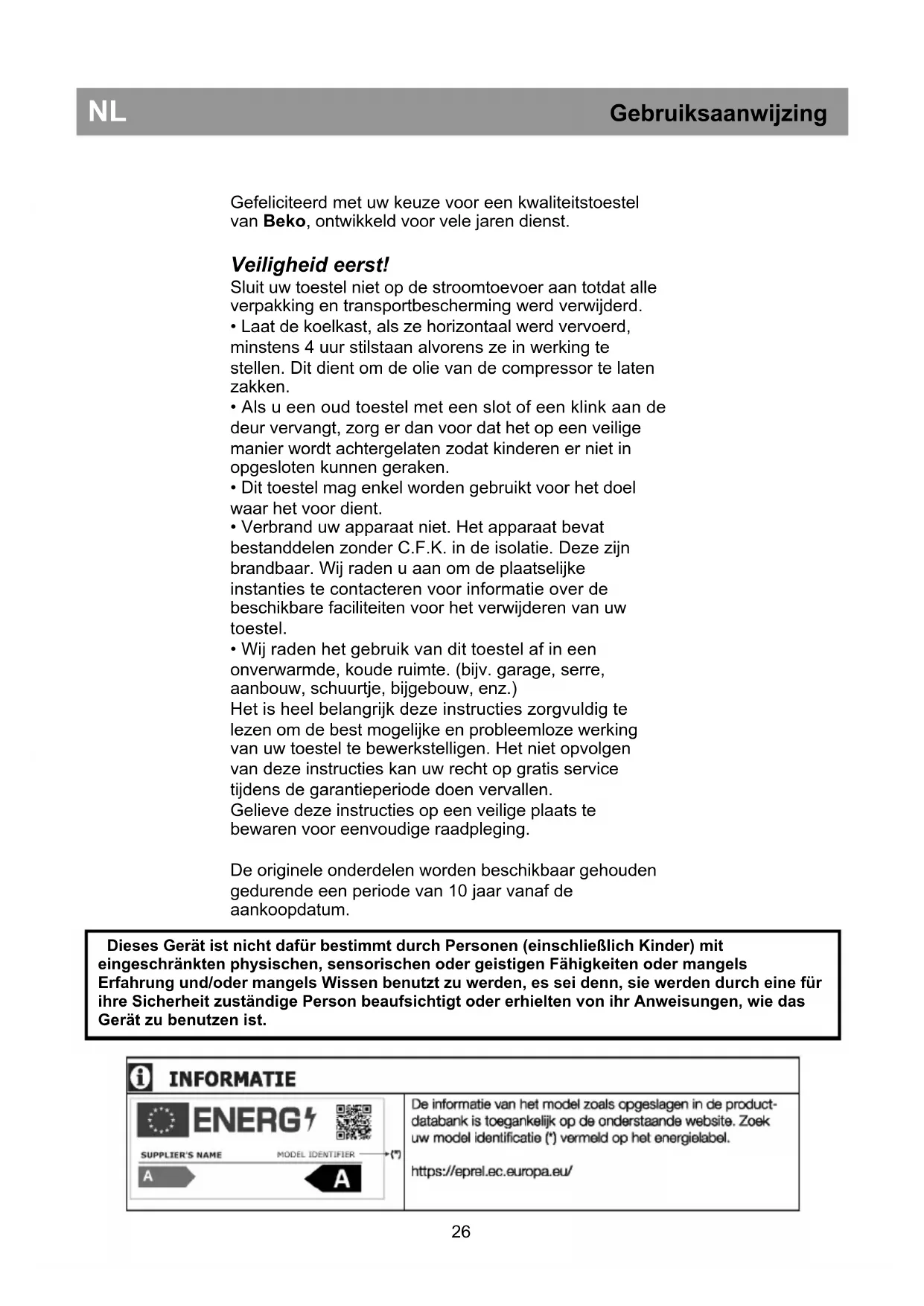Dieses Gerät ist nicht dafür bestimmt durch Personen (einschließlich Kinder) mit eingeschränkten physischen, sensorischen oder geistigen Fähigkeiten oder mangels Erfahrung und/oder mangels Wissen benutzt zu werden, es sei denn, sie werden durch eine für ihre Sicherheit zuständige Person beaufsichtigt oder erhielten von ihr Anweisungen, wie das Gerät zu benutzen ist.NL Gebruiksaanwijzing Elektriciteitsvereisten Vergewis u ervan, alvorens u de stekker in het stopcontact steekt, dat de voltage en de frequentie op de kwalificatieplaat binnenin het toestel overeenkomen met uw stroomtoevoer. Wij raden u aan dit toestel aan te sluiten op de hoofdtoevoer via een naar behoren aangesloten en verzekerd stopcontact op een onmiddellijk bereikbare plaats. Waarschuwing! Dit toestel moet worden geaard. Herstellingen aan de elektrische uitrusting mogen enkel door een gekwalificeerde technicus worden uitgevoerd. Foutieve herstellingen, die werden uitgevoerd door een ongekwalificeerde persoon, houden risico’s in die kritieke gevolgen kunnen hebben voor de gebruiker van het toestel. OPGELET! Dit toestel werkt op R600a. Dit is een milieuvriendelijk, maar brandbaar gas. Tijdens het transport en de plaatsing van het product moet er zorg voor worden gedragen dat het koelsysteem niet wordt beschadigd. Als het koelsysteem toch wordt beschadigd en er ontstaat een gaslek, houd het product dan verwijderd van open vuurbronnen en verlucht de kamer een tijdje. WAARSCHUWING - Gebruik geen andere mechanische toestellen of andere middelen om het ontdooiingproces te versnellen dan die toestellen of middelen die door de fabrikant worden aangeraden. WAARSCHUWING - Beschadig het koelcircuit niet. WAARSCHUWING - Gebruik geen elektrische toestellen in de bewaarladen van het toestel, tenzij ze door de fabrikant worden aangeraden. WAARSCHUWING - Indien het netsnoer beschadigd is, moet dit door de producent, de dealer of een ander gekwalificeerd persoon worden gerepareerd om gevaar te voorkomen. Transportinstructies