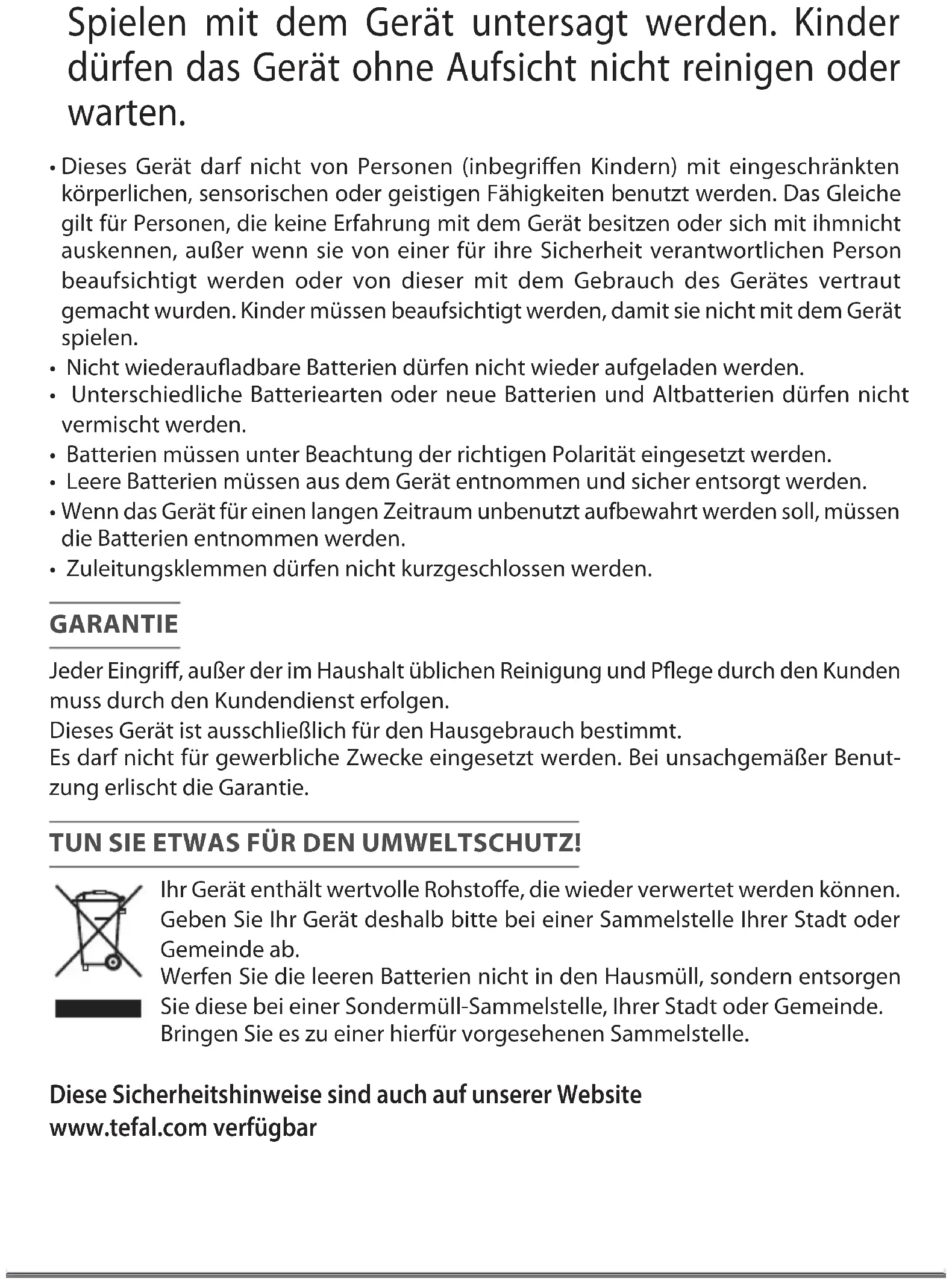 - Er mag geen kortsluiting worden veroorzaakt tussen de voed ingsklemmen. GARANTIE Dit apparaat is alleen bestemd voor huishoudelijk gebruik. Het kan niet voor bedrijfsmatige doeleinden gebruikt worden. De garantie is niet geldig in geval van een oneigenlijk gebruik. WEES VRIENDELIJK VOOR HET MILIEU! Uw apparaat bevat materialen die geschikt zijn voor hergebruik. Lever het in bij het milieustation in uw gemeente of bij onze technische dienst. Werp lege batterijen niet weg: verwerk ze als klein chemisch afval. Breng ze naar een speciaal, centraal afvalinzamelpunt. Deze voorschriften kunt u nalezen op onze website www.tefal.com