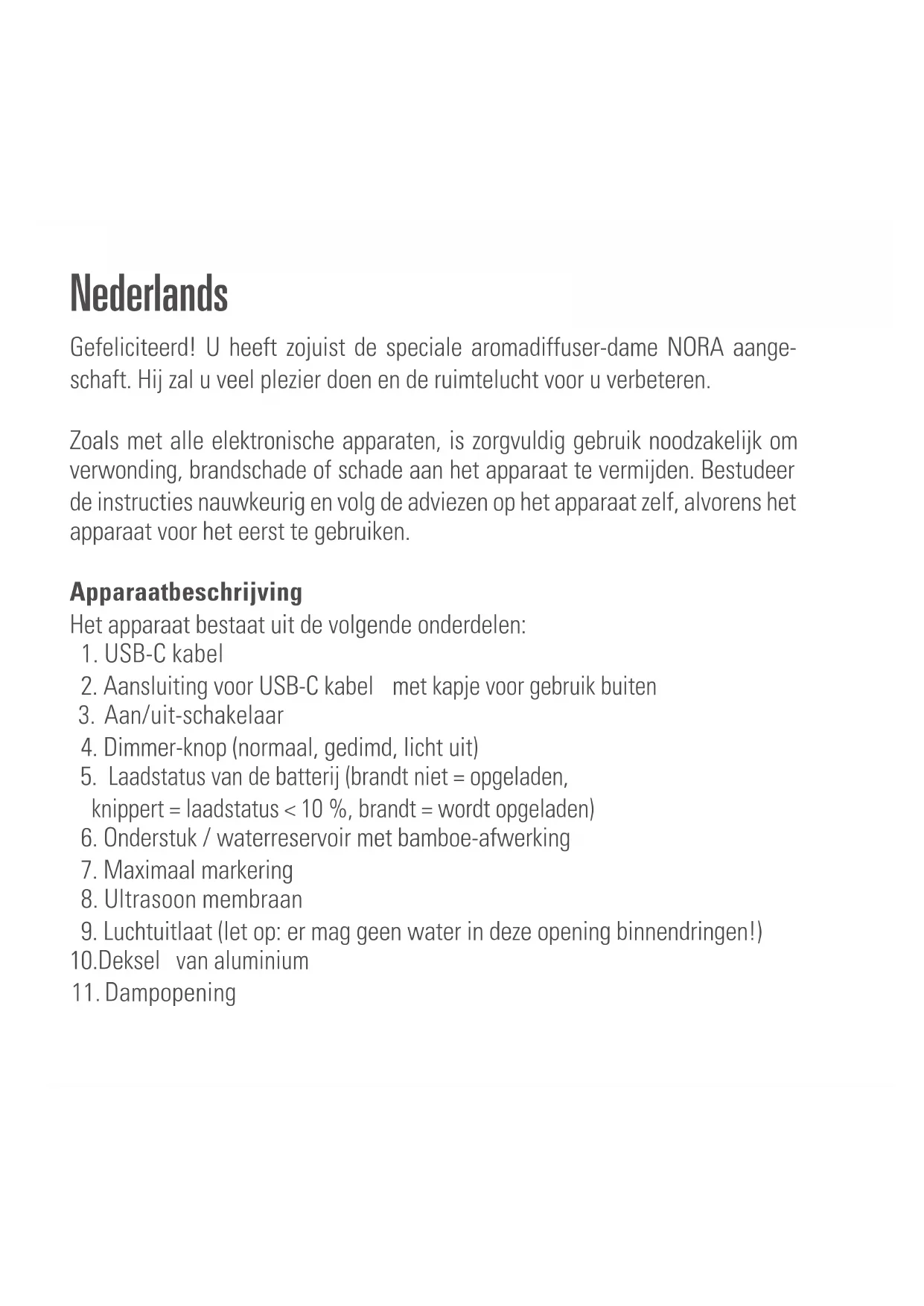 - Neem in geval van reparatie de volgende punten in acht voordat het apparaat wordt verzonden of naar de dealer wordt gebracht: waterbakje resp. water- tank volledig legen en het apparaat volledig laten drogen. Restwater bescha- digt het apparaat tijdens het transport. De garantie vervalt in dat geval. Verwijdering De Europese richtlijn 2012 / 19 / EG inzake Afval van Elektrische en Elektronische Apparatuur (AEEA), vereist dat oude elektrische huishoudapparaten niet in de normale gemeentelijke ongesorteerde afvalstroom mogen worden weggegooid. Oude apparaten moeten apart worden ingezameld om recycling en hergebruik van de materialen daarin te optimaliseren en de gevolgen op het milieu en de volksgezondheid te verminderen. Het symbool met de doorgekruiste “vuilnisbak op wieltjes” op het product, herinnert u aan uw verplichting, dat het toestel bijverwijdering gescheiden ingezameld moet worden. Consumenten moeten con- tact opnemen met hun lokale autoriteit of verkoper voor informatie betreffende de juiste verwijdering van hun oude toestel. Afvalverwijdering accu: Dit apparaat heeft een batterij die niet kan worden vervangen. Lever de accu als hij leeg is in bij het inzamelpunt voor klein chemisch afval van uw ge- meente. Niet via het huisafval verwijderen. De elektrode is verpakt in isolerend papier, kan worden gerecycled en hergebruikt. Specificaties Nominale spanning DC 5 V Nominale vermogen 3 W Looptijd 7 h op de accu, max. 18 h op stroom Afmetingen 101 x 83 mm(diameter x hoogte) Gewicht 300 g Tankinhoud 90 ml Geluidsdrempel < 26 dB(A) Temperatuurbereik oplading accu 0–45 °C, Luchtvochtigheid ≤85 % RH Accumodel YY-1S2P18650 -5200mAh EU-verordening CE / AEEA / RoHS / EAC / UKCA De inhoud van deze gebruiksaanwijzing kan zonder voorafgaand bericht worden gewijzigdDansk Tillykke! Du har netop anskaffet dig den usædvanlige aroma diffuser-dame NORA. Den vil bringe dig megen glæde og forbedre dit indeklima. Som med alle elektriske husholdningsapparater er særlig pleje en nødvendighed også med dette produkt, for at undgå fysisk skade, brandskade eller beskadigel- se af produktet. Læs venligst denne brugsanvisning grundigt før produktet tages i brug, og følg sikkerhedsanvisningerne på selve produktet. Beskrivelse af apparatet Apparatet består af følgende hoveddele: