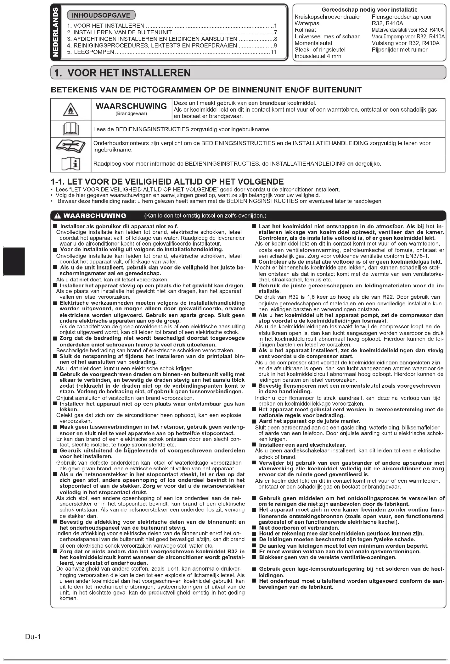 Gebruik de voorgeschreven draden om binnen- en buitenunit veilig met elkaar te verbinden, en bevestig de draden stevig aan het aansluitblok zodat trekkracht in de draden niet op de verbindingspunten komt te staan. Verleng de bedrading niet, of gebruik geen tussenverbindingen. Onjuist aansluiten of vastzetten kan brand veroorzaken. Installeer het apparaat niet op een plaats waar ontvlambaar gas kan lekken. Gelekt gas dat zich om de airconditioner heen ophoopt, kan een explosie veroorzaken. Maak geen tussenverbindingen in het netsnoer, gebruik geen verleng-snoer en sluit niet te veel apparaten aan op hetzelfde stopcontact. Er kan dan brand of een elektrische schok ontstaan door een slecht con-tact, slechte isolatie, te hoge stroomsterkte etc. Gebruik uitsluitend de bijgeleverde of voorgeschreven onderdelen voor het installeren. Gebruik van defecte onderdelen kan letsel of waterlekkage veroorzaken als gevolg van brand, een elektrische schok of vallen van het apparaat. Als u de netsnoerstekker in het stopcontact steekt, let er dan op dat zich geen stof, andere opeenhoping of los onderdeel bevindt in het stopcontact of aan de stekker. Zorg er voor dat u de netsnoerstekker volledig in het stopcontact drukt. Als zich stof, een andere opeenhoping of een los onderdeel aan de net-snoerstekker of in het stopcontact bevindt, kan brand of een elektrische schok ontstaan. Als van de netsnoerstekker een onderdeel los zit, vervang de stekker dan. Bevestig de afdekking voor elektrische delen van de binnenunit en het onderhoudspaneel van de buitenunit stevig. Indien de afdekking voor elektrische delen van de binnenunit en/of het on-derhoudspaneel van de buitenunit niet goed bevestigd is/zijn, kan dit brand of een elektrische schok veroorzaken vanwege stof, water etc. Zorg dat er niets anders dan het voorgeschreven koelmiddel R32 in het koelmiddelcircuit komt wanneer de airconditioner wordt geïnstal-leerd, verplaatst of onderhouden. De aanwezigheid van andere stoffen, zoals lucht, kan abnormale drukver-hoging veroorzaken die kan leiden tot een explosie of lichamelijk letsel. Als u een ander koelmiddel dan het voorgeschreven koelmiddel gebruikt, kan dit leiden tot mechanische storingen, systeemstoringen of uitval van de unit. In het slechtste geval kan de productveiligheid ernstig in het geding komen. Laat het koelmiddel niet ontsnappen in de atmosfeer. Als bij het in-stalleren lekkage van koelmiddel optreedt, ventileer dan de kamer. Controleer, als de installatie voltooid is, of er geen koelmiddel lekt. Als er koelmiddel lekt en dit in contact komt met vuur of een warmtebron, zoals een ventilatorverwarming, petroleumkachel of fornuis, ontstaat er een schadelijk gas. Zorg voor voldoende ventilatie conform EN378-1. Controleer als de installatie voltooid is of er geen koelmiddelgas lekt. Mocht er binnenshuis koelmiddelgas lekken, dan kunnen schadelijke stof-fen ontstaan als dat in contact komt met de warmte van een ventilatorka-chel, straalkachel, fornuis etc. Gebruik de juiste gereedschappen en leidingmaterialen voor de in-stallatie. De druk van R32 is 1,6 keer zo hoog als die van R22. Door gebruik van onjuiste gereedschappen of materialen en een onvolledige installatie kun-nen leidingen barsten en verwondingen ontstaan. Als u het koelmiddel uit het apparaat pompt, zet de compressor dan stop voordat u de koelmiddelleidingen losmaakt. Als u de koelmiddelleidingen losmaakt terwijl de compressor loopt en de afsluitkraan open is, dan kan lucht aangezogen worden waardoor de druk in het koelmiddelcircuit abnormaal hoog oploopt. Hierdoor kunnen de lei-dingen barsten en letsel veroorzaken. Als u het apparaat installeert, zet de koelmiddelleidingen dan stevig vast voordat u de compressor start. Als u de compressor start voordat de koelmiddelleidingen aangesloten zijn en de afsluitkraan is open, dan kan lucht aangezogen worden waardoor de druk in het koelmiddelcircuit abnormaal hoog oploopt. Hierdoor kunnen de leidingen barsten en letsel veroorzaken. Bevestig ensmoeren met een momentsleutel zoals voorgeschreven in deze handleiding. Indien u een ensmoer te strak aandraait, kan deze na verloop van tijd breken en koelmiddellekkage veroorzaken. Het apparaat moet geïnstalleerd worden in overeenstemming met de nationale regels voor bedrading. Aard het apparaat op de juiste manier. Sluit geen aardedraad aan op een gasleiding, waterleiding, bliksemaeider of aarde van een telefoon. Door onjuiste aarding kunt u elektrische schok-ken krijgen. Installeer een aardlekschakelaar. Als u geen aardlekschakelaar installeert, kan dit leiden tot een elektrische schok of brand. Verwijder bij gebruik van een gasbrander of andere apparatuur met vlamwerking alle koelmiddel volledig uit de airconditioner en zorg ervoor dat de ruimte goed geventileerd is. Als er koelmiddel lekt en dit in contact komt met vuur of een warmtebron, ontstaat er een schadelijk gas en bestaat er brandgevaar. Gebruik geen middelen om het ontdooiingsproces te versnellen of om te reinigen die niet zijn aanbevolen door de fabrikant. Het apparaat moet zich in een kamer bevinden zonder continu func-tionerende ontstekingsbronnen (zoals open vuur, een functionerend gastoestel of een functionerende elektrische kachel). Niet doorboren of verbranden. Houd er rekening mee dat koelmiddelen geurloos kunnen zijn. De leidingen moeten beschermd zijn tegen fysieke schade. De aanleg van leidingen moet tot een minimum worden beperkt. Er moet worden voldaan aan de nationale gasverordeningen. Blokkeer geen van de vereiste ventilatie-openingen. Gebruik geen lage-temperatuurlegering bij het solderen van de koel-leidingen. Het onderhoud moet uitsluitend worden uitgevoerd conform de aan-bevelingen van de fabrikant. Gereedschap nodig voor installatie Kruiskopschroevendraaier Waterpas Rolmaat Universeel mes of schaar Momentsleutel Steek- of ringsleutel Inbussleutel 4 mm Flensgereedschap voor R32, R410A Meterverdeelstuk voor R32, R410A Vacuümpomp voor R32, R410A Vulslang voor R32, R410A Pijpsni