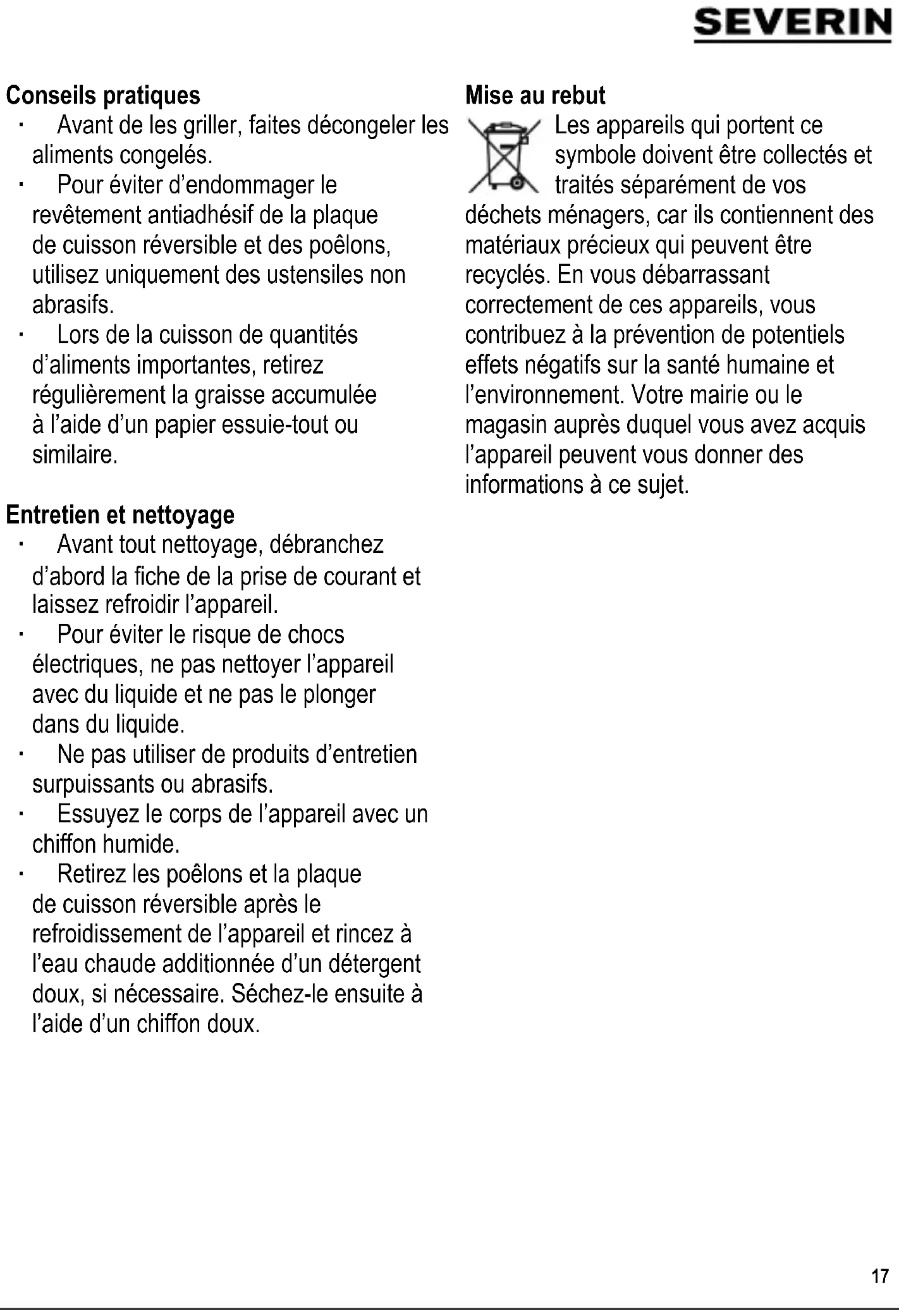 van het apparaat kan verdwijnen (lichte rookontwikkeling is mogelijk). Zorg daarom voor voldoende ventilatie door geopende ramen of balkondeuren. ∙ Maak het toestel daarna schoon zoals beschreven in het hoofdstuk Onderhoud en schoonmaken. Omkeerbare grillplaat ∙ Leg voor het in gebruik nemen de omkeerbare grillplaat op het apparaat. ∙ Beide zijden van de omkeerbare grillplaat kunnen worden gebruikt. Het geribbelde deel is geschikt voor het grillen van vlees, wordt enz. De gladde delen zijn bijzonder geschikt voor vis en groenten. ∙ Voor het gebruik licht insmeren met olie. Regelbare thermostaat en controlelampje ∙ Met de thermostaat kan de temperatuur worden ingesteld tussen MIN en MAX. ∙ Het controlelampje geeft de status van het verwarmingselement aan: Verwarming aan = controlelampje aan Verwarming uit = controlelampje uit ∙ Na het beëindigen van maaltijdbereiding, thermostaat in laagste stand draaien, en stekker uit het stopcontact trekken. Gebruik Tip: Voor optimaal grillgenot moet het vlees 30 minuten vóór het grillen uit de koeler gehaald worden en op een afgedekt bord blijven liggen. ∙ De omkeerbare grillplaat op het apparaat plaatsen. ∙ Stop de stekker in het stopcontact en draai de thermostaat geheel naar rechts. ∙ Laat het apparaat voor 10 minuten voorverwarmen totdat de gewenste temperatuur bereikt is. ∙ Leg eventueel te grillen voeding op de omkeerbare grillplaat. ∙ Plaats de raclette kaas in de mini pannetjes. Plaats de mini pannetjes in het apparaat, onder het verwarmingselement, en laat ze daar staan totdat de kaas gesmolten is. ∙ Waarschuwing: Plaats nooit lege mini pannetjes in het apparaat wanneer het is aangezet. ∙ Na gebruik, draai de thermostaat geheel naar links en verwijder de stekker van het stroomnet. Voorbereiden van raclettekaas Snij per persoon ca. 200-300 gram zachte kaas in plakken van 3-5 mm. Doe deze plakken in de pannetjes. Het is te prefereren de originele raclette kaas te gebruiken. Elke andere snel smeltende kaas is echter ook geschikt. Praktische tips ∙ Diepvries voedsel moet, voordat het bereid wordt, altijd op de juiste manier ontdooid worden. ∙ Om schade aan de coating van de omkeerbare grillplaat en de mini pannetjes te voorkomen, alleen niet- krassende keukengerei gebruiken. ∙ Wanneer men grote hoeveelheden voedsel grilt, moet men het opgehoopte vet van tijd tot tijd voorzichtig22 104 x 142 mm verwijderen; gebruik geschikte keukendoeken of iets gelijkwaardig. Onderhoud en schoonmaken ∙ Haal vóór het schoonmaken altijd de stekker uit het stopcontact en laat het apparaat afkoelen. ∙ Om elektrische schokken te voorkomen dit apparaat nooit met vloeistoffen schoonmaken of onderdompelen. ∙ Geen scherpe of schurende reinigingsmiddelen gebruiken. ∙ Reinig de buitenkant van het apparaat met een vochtige doek. ∙ Verwijder de pannetjes en de omkeerbare grillplaat nadat deze afgekoeld zijn en spoel deze af met een beetje heet water. Wanneer nodig, kan men wat zachte zeep gebruiken. Hierna goed afdrogen af met een zachte doek. Afval weggooien Instrumenten gemerkt met dit symbool moeten apart weggegooid worden van het huishoudelijke afval, daar deze waardevolle materialen bevatten welke men kan recyclen. Juist wegdoen zal het milieu en de menselijke gezondheid beschermen. De plaatselijke autoriteit of handelaar kan daar informatie over geven.104 x 142 mm