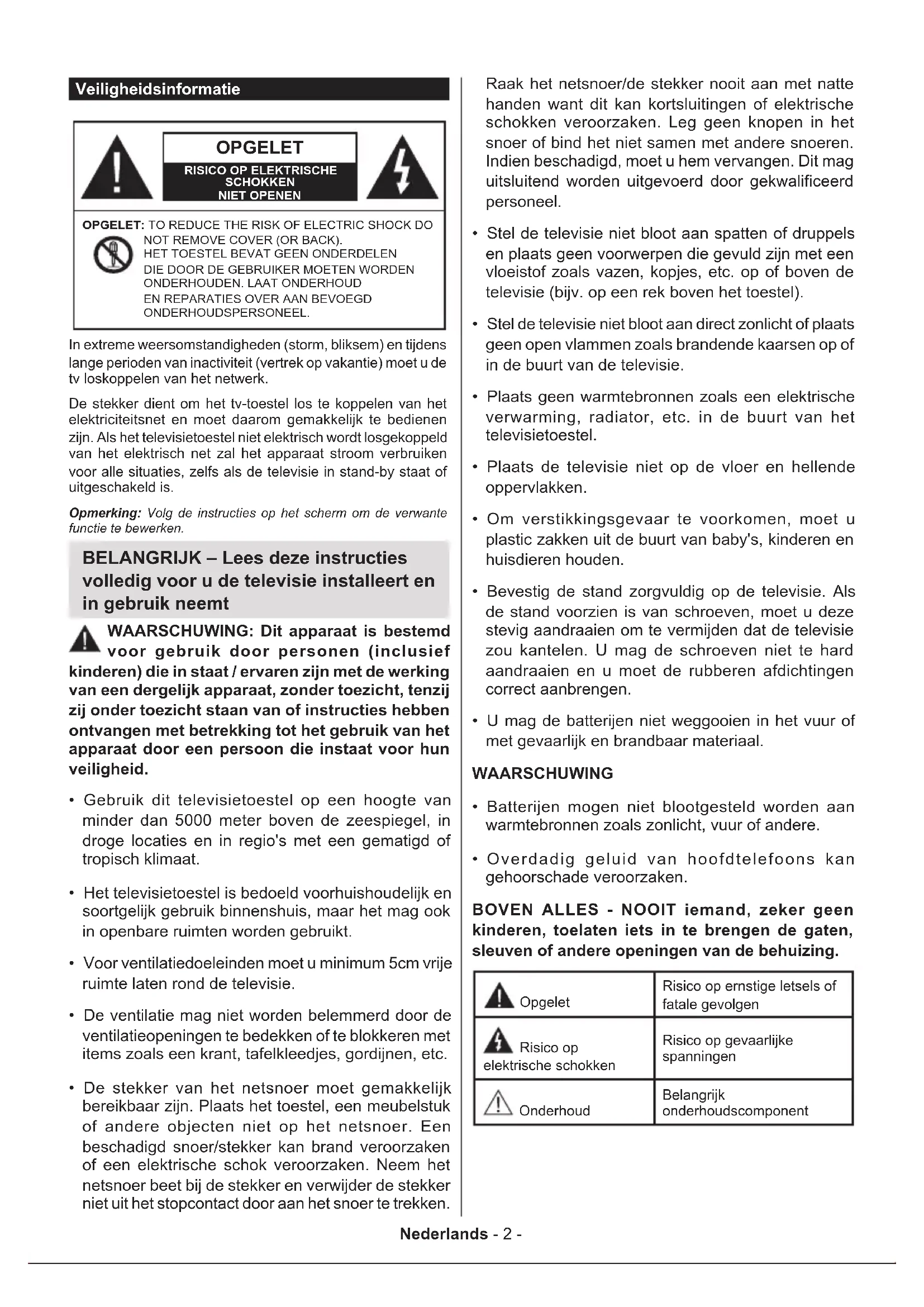 - Het gebruik van ophangbeugels, of het zelf installeren van een ophangbeugel aan de muur houden het risico in van persoonlijke letsels en schade aan het product. Om de prestatie en de veiligheid vanNederlands - 4 - het product te handhaven, moet u er absoluut zeker van zijn uw verdeler of een gelicentieerde onderaannemer te vragen de ophangbeugels te bevestigen. Elke schade veroorzaakt door de installatie zonder een gekwalificeerde installateur resulteert in de nietigverklaring van uw garantie.