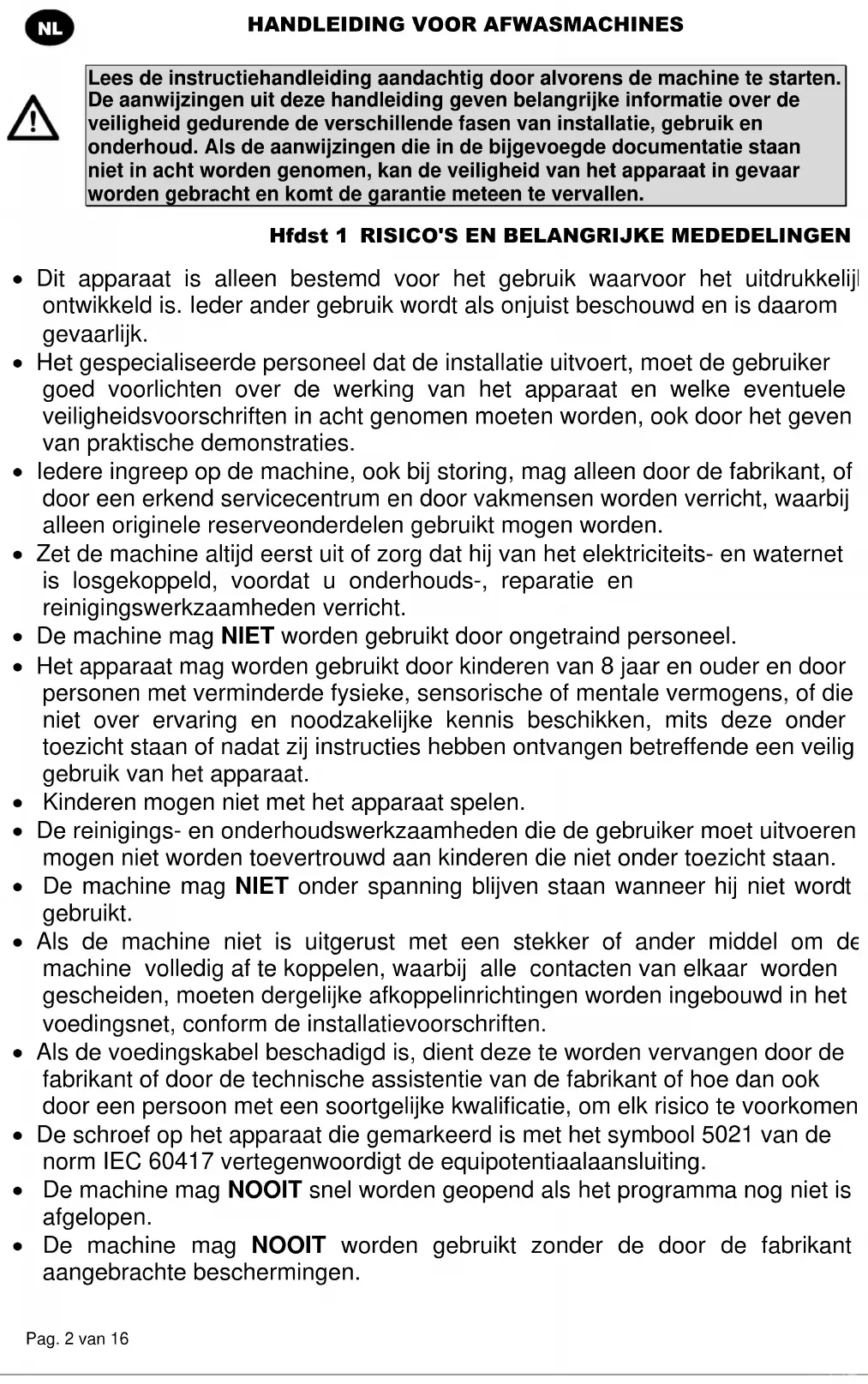 Lees de instructiehandleiding aandachtig door alvorens de machine te starten. De aanwijzingen uit deze handleiding geven belangrijke informatie over de veiligheid gedurende de verschillende fasen van installatie, gebruik en onderhoud. Als de aanwijzingen die in de bijgevoegde documentatie staan niet in acht worden genomen, kan de veiligheid van het apparaat in gevaar worden gebracht en komt de garantie meteen te vervallen. Hfdst 1 RISICO'S EN BELANGRIJKE MEDEDELINGEN Dit apparaat is alleen bestemd voor het gebruik waarvoor het uitdrukkelijk ontwikkeld is. Ieder ander gebruik wordt als onjuist beschouwd en is daarom gevaarlijk. Het gespecialiseerde personeel dat de installatie uitvoert, moet de gebruiker goed voorlichten over de werking van het apparaat en welke eventuele veiligheidsvoorschriften in acht genomen moeten worden, ook door het geven van praktische demonstraties. Iedere ingreep op de machine, ook bij storing, mag alleen door de fabrikant, of door een erkend servicecentrum en door vakmensen worden verricht, waarbij alleen originele reserveonderdelen gebruikt mogen worden. Zet de machine altijd eerst uit of zorg dat hij van het elektriciteits- en waternet is losgekoppeld, voordat u onderhouds-, reparatie en reinigingswerkzaamheden verricht. De machine mag NIET worden gebruikt door ongetraind personeel. Het apparaat mag worden gebruikt door kinderen van 8 jaar en ouder en door personen met verminderde fysieke, sensorische of mentale vermogens, of die niet over ervaring en noodzakelijke kennis beschikken, mits deze onder toezicht staan of nadat zij instructies hebben ontvangen betreffende een veilig gebruik van het apparaat. Kinderen mogen niet met het apparaat spelen. De reinigings- en onderhoudswerkzaamheden die de gebruiker moet uitvoeren mogen niet worden toevertrouwd aan kinderen die niet onder toezicht staan. De machine mag NIET onder spanning blijven staan wanneer hij niet wordt gebruikt. Als de machine niet is uitgerust met een stekker of ander middel om de machine volledig af te koppelen, waarbij alle contacten van elkaar worden gescheiden, moeten dergelijke afkoppelinrichtingen worden ingebouwd in het voedingsnet, conform de installatievoorschriften. Als de voedingskabel beschadigd is, dient deze te worden vervangen door de fabrikant of door de technische assistentie van de fabrikant of hoe dan ook door een persoon met een soortgelijke kwalificatie, om elk risico te voorkomen. De schroef op het apparaat die gemarkeerd is met het symbool 5021 van de norm IEC 60417 vertegenwoordigt de equipotentiaalaansluiting. De machine mag NOOIT snel worden geopend als het programma nog niet is afgelopen. De machine mag NOOIT worden gebruikt zonder de door de fabrikant aangebrachte beschermingen.HANDLEIDING VOOR AFWASMACHINES Pag. 3 van 16