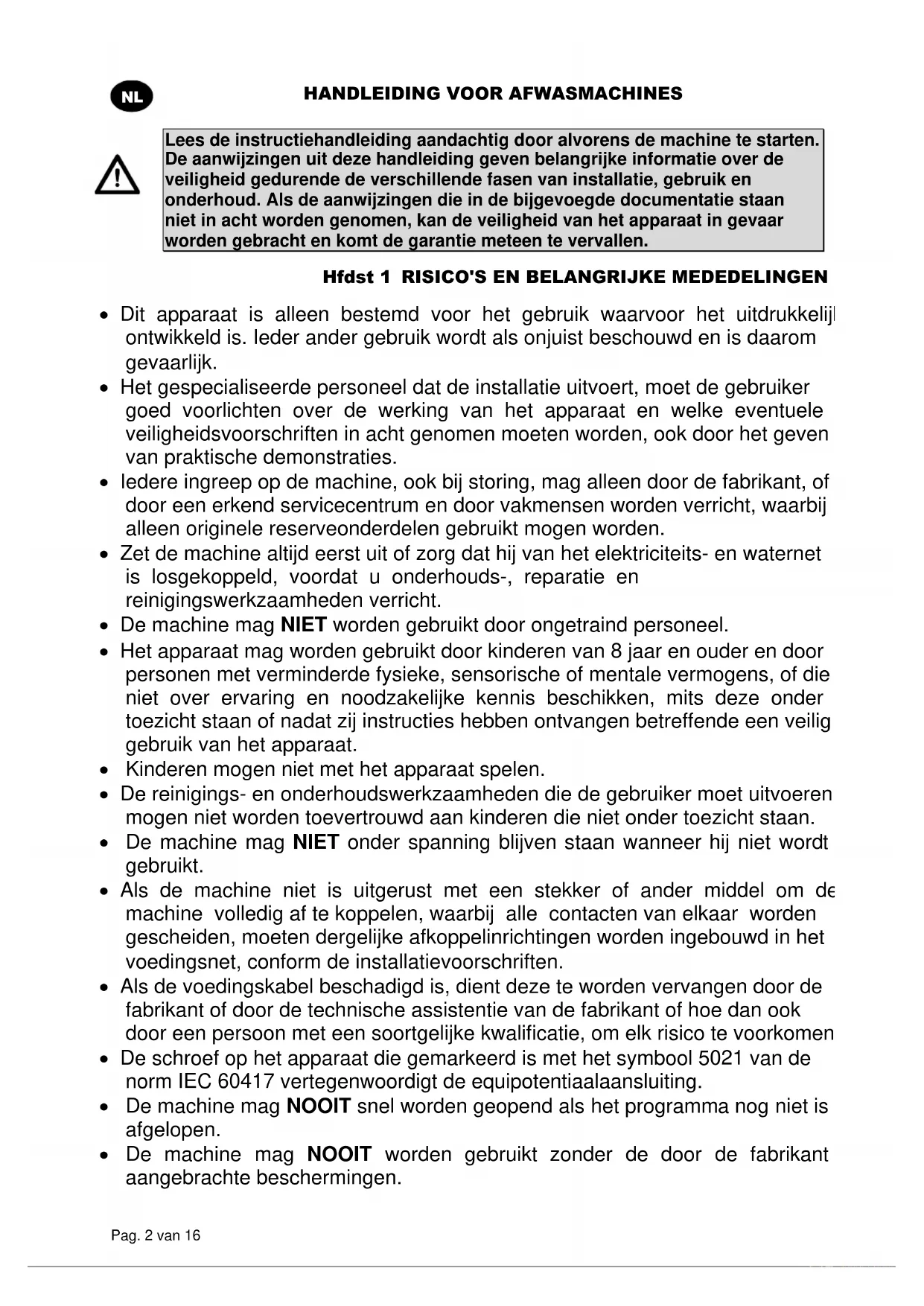 Lees de instructiehandleiding aandachtig door alvorens de machine te starten. De aanwijzingen uit deze handleiding geven belangrijke informatie over de veiligheid gedurende de verschillende fasen van installatie, gebruik en onderhoud. Als de aanwijzingen die in de bijgevoegde documentatie staan niet in acht worden genomen, kan de veiligheid van het apparaat in gevaar worden gebracht en komt de garantie meteen te vervallen. Hfdst 1 RISICO'S EN BELANGRIJKE MEDEDELINGEN Dit apparaat is alleen bestemd voor het gebruik waarvoor het uitdrukkelijk ontwikkeld is. Ieder ander gebruik wordt als onjuist beschouwd en is daarom gevaarlijk. Het gespecialiseerde personeel dat de installatie uitvoert, moet de gebruiker goed voorlichten over de werking van het apparaat en welke eventuele veiligheidsvoorschriften in acht genomen moeten worden, ook door het geven van praktische demonstraties. Iedere ingreep op de machine, ook bij storing, mag alleen door de fabrikant, of door een erkend servicecentrum en door vakmensen worden verricht, waarbij alleen originele reserveonderdelen gebruikt mogen worden. Zet de machine altijd eerst uit of zorg dat hij van het elektriciteits- en waternet is losgekoppeld, voordat u onderhouds-, reparatie en reinigingswerkzaamheden verricht. De machine mag NIET worden gebruikt door ongetraind personeel. Het apparaat mag worden gebruikt door kinderen van 8 jaar en ouder en door personen met verminderde fysieke, sensorische of mentale vermogens, of die niet over ervaring en noodzakelijke kennis beschikken, mits deze onder toezicht staan of nadat zij instructies hebben ontvangen betreffende een veilig gebruik van het apparaat. Kinderen mogen niet met het apparaat spelen. De reinigings- en onderhoudswerkzaamheden die de gebruiker moet uitvoeren mogen niet worden toevertrouwd aan kinderen die niet onder toezicht staan. De machine mag NIET onder spanning blijven staan wanneer hij niet wordt gebruikt. Als de machine niet is uitgerust met een stekker of ander middel om de machine volledig af te koppelen, waarbij alle contacten van elkaar worden gescheiden, moeten dergelijke afkoppelinrichtingen worden ingebouwd in het voedingsnet, conform de installatievoorschriften. Als de voedingskabel beschadigd is, dient deze te worden vervangen door de fabrikant of door de technische assistentie van de fabrikant of hoe dan ook door een persoon met een soortgelijke kwalificatie, om elk risico te voorkomen. De schroef op het apparaat die gemarkeerd is met het symbool 5021 van de norm IEC 60417 vertegenwoordigt de equipotentiaalaansluiting. De machine mag NOOIT snel worden geopend als het programma nog niet is afgelopen. De machine mag NOOIT worden gebruikt zonder de door de fabrikant aangebrachte beschermingen.HANDLEIDING VOOR AFWASMACHINES Pag. 3 van 16
