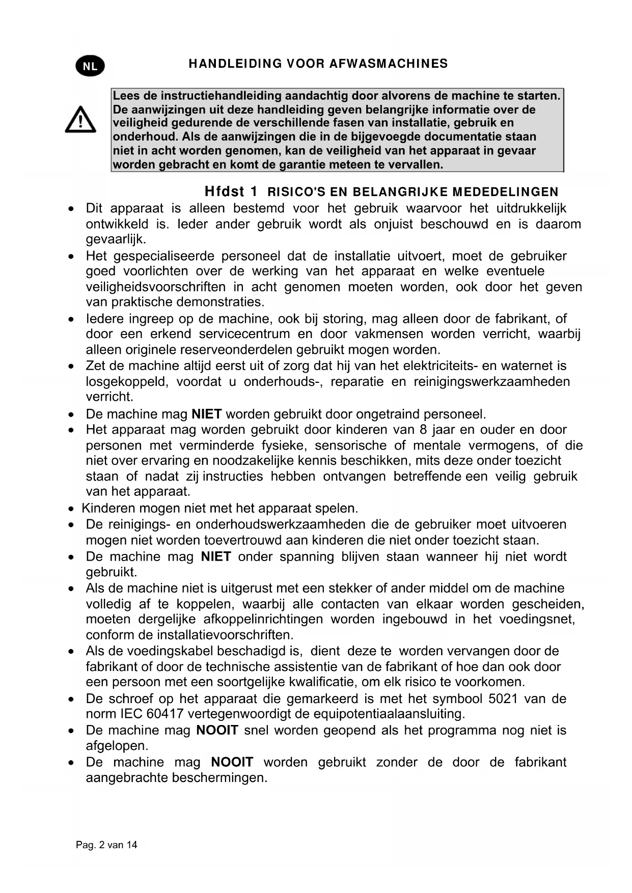 ls de voedingskabel beschadigd is, dient deze te worden vervangen door de fabrikant of door de technische assistentie van de fabrikant of hoe dan ook door een persoon met een soortgelijke kwalificatie, om elk risico te voorkomen. De schroef op het apparaat die gemarkeerd is met het symbool 5021 van de norm IEC 60417 vertegenwoordigt de equipotentiaalaansluiting. De machine mag NOOIT snel worden geopend als het programma nog niet is afgelopen. De machine mag NOOIT worden gebruikt zonder de door de fabrikant aangebrachte beschermingen.HANDLEIDING VOOR AFWASMACHINES Pag. 3 van 14