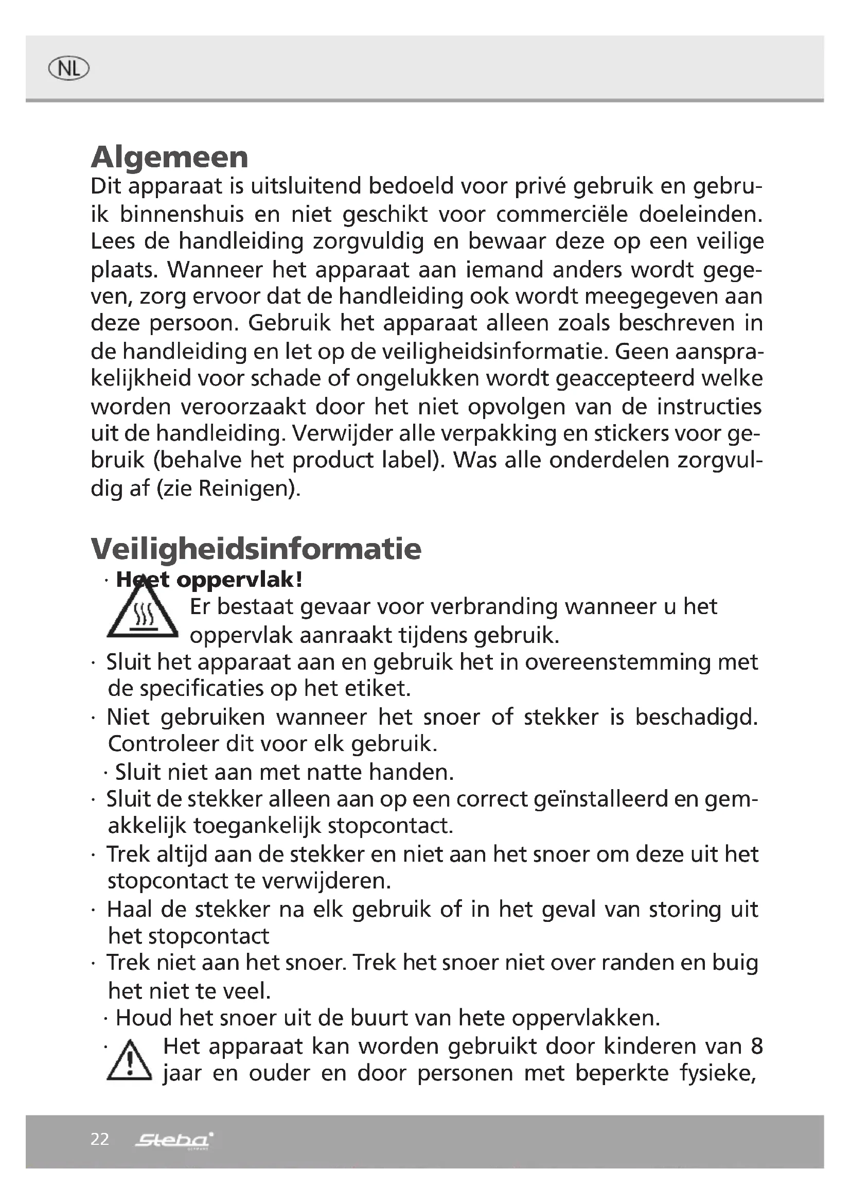 5 = Donkere wafels De baktijd is: ca. 4-5 minuten (hangt af van uw smaak) Maak, bij het afhalen van de wafels, gebruik van een houten of hittebestendige plastic lepel. Verwijder de stekker uit het stopcontact als het bakken klaar is. Gebruik al het deeg, aangezien de structuur veranderd en het eieren bevat. Voor het eerste gebruik: de eerste wafel niet eten, in verband met de hygiëne!26 Opslag Voor het opbergen wikkelt u de aansluitkabel rond de onderkant van het apparaat en steekt u vervolgens de pinnen van de stekker in de twee gaten op de behuizing. Zoete wafels: ∙ 250g bloem ∙ 3 tl suiker ∙ 1 zakje vanillesuiker ∙ 1 zakje bakpoeder ∙ ¼ tl zout ∙ 3 eieren, dooier en eiwit van elkaar ge- scheiden ∙ 125g boter, gesmolten ∙ 300ml melk ∙ Rum aroma ∙ Poedersuiker (als decoratie) Meng de bloem, suiker , vanillesuiker, bakpoeder en zout. Meng in een ande- re kom de eierdooiers, melk, boter en aroma. Voeg het bloemmengsel hier aan toe. Klop de eiwitten op en meng deze voorzichtig door het beslag. Hartige wafels: ∙ 250g bloem ∙ 1 zakje bakpoeder ∙ ¼ tl zout ∙ 3 eieren, dooier en eiwit van elkaar ge- scheiden ∙ 300ml melk ∙ Peper ∙ 100g ham in blokjes ∙ 100g geraspte kaas Meng de bloem, bakpoeder en zout. Meng in een andere kom de eierdooiers, melk en peper. Voeg het bloemmengsel hier aan toe en roer de ham en kaas er door heen. Klop de eiwitten op en meng deze voorzichtig door het beslag.27 Tip: U kunt met de ingrediënten variëren, grof geraspte appels, rozijnen, olijven etc. kun- nen door het deeg worden gemend. Karnemelk of room geeft een andere smaak. Andere vormen van deeg uit receptenboeken kunnen ook eenvoudig worden bereid met dit apparaat. Laat het deeg gedurende 30 minuten rijzen. Probleem oplossen Beste klant, Hartelijk dank voor de aankoop van dit hoogwaardige STEBA artikel. De volgende tabel zal u helpen met problemen die zich kunnen voordoen bij het gebruik van het apparaat. Voor veel problemen is er een eenvoudige oplossing, want niet alles wat lijkt op een storing is ernstig. Controleer de volgende lijst voordat u contact opneemt met de klantenservice. Probleem Reden Oplossing Geen rode licht nadat het apparaat is aangesloten ∙ Geen stroom ∙ Te veel apparaten aan één stroomkabel ∙ Controleer of de stek- ker juist is aangesloten ∙ Controleer de zekering Het groente licht is niet aan, terwijl het apparaat aan staat of het lampje gaat uit ∙ De gewenste tempera- tuur is bereikt ∙ Het apparaat houdt bij wanneer de gewenste temperatuur is bereikt. De lamp gaat dan aan en uit. Het deeg komt op de werkbank/aanrecht terecht ∙ Er is teveel deeg ge- bruikt ∙ Gebruik minder deeg De wafel is niet bruin genoeg ∙ De temperatuur staat te laag ∙ De baktijd is te kort ∙ Het deeg bevat teveel vloeitstof ∙ Verhoog de temper- atuur ∙ Verhoog de tijd van bakken Anti-aanbak laag wordt slechter zitten krassen o