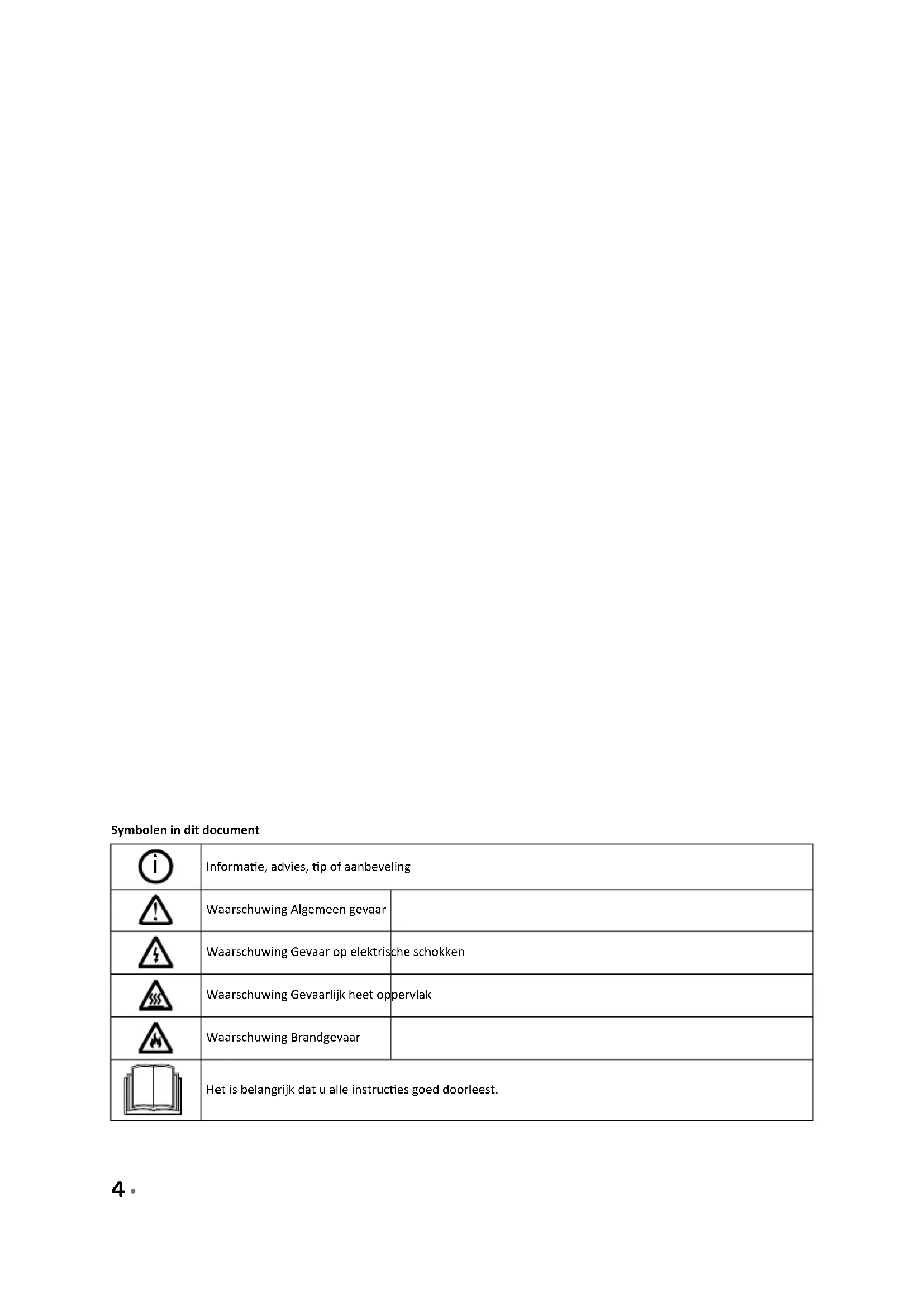Informae, advies, p of aanbeveling Waarschuwing Algemeen gevaar Waarschuwing Gevaar op elektrische schokken Waarschuwing Gevaarlijk heet oppervlak Waarschuwing Brandgevaar Het is belangrijk dat u alle instruces goed doorleest.Nederlands • 5 Nederlands veiligheidsvoorschriften1