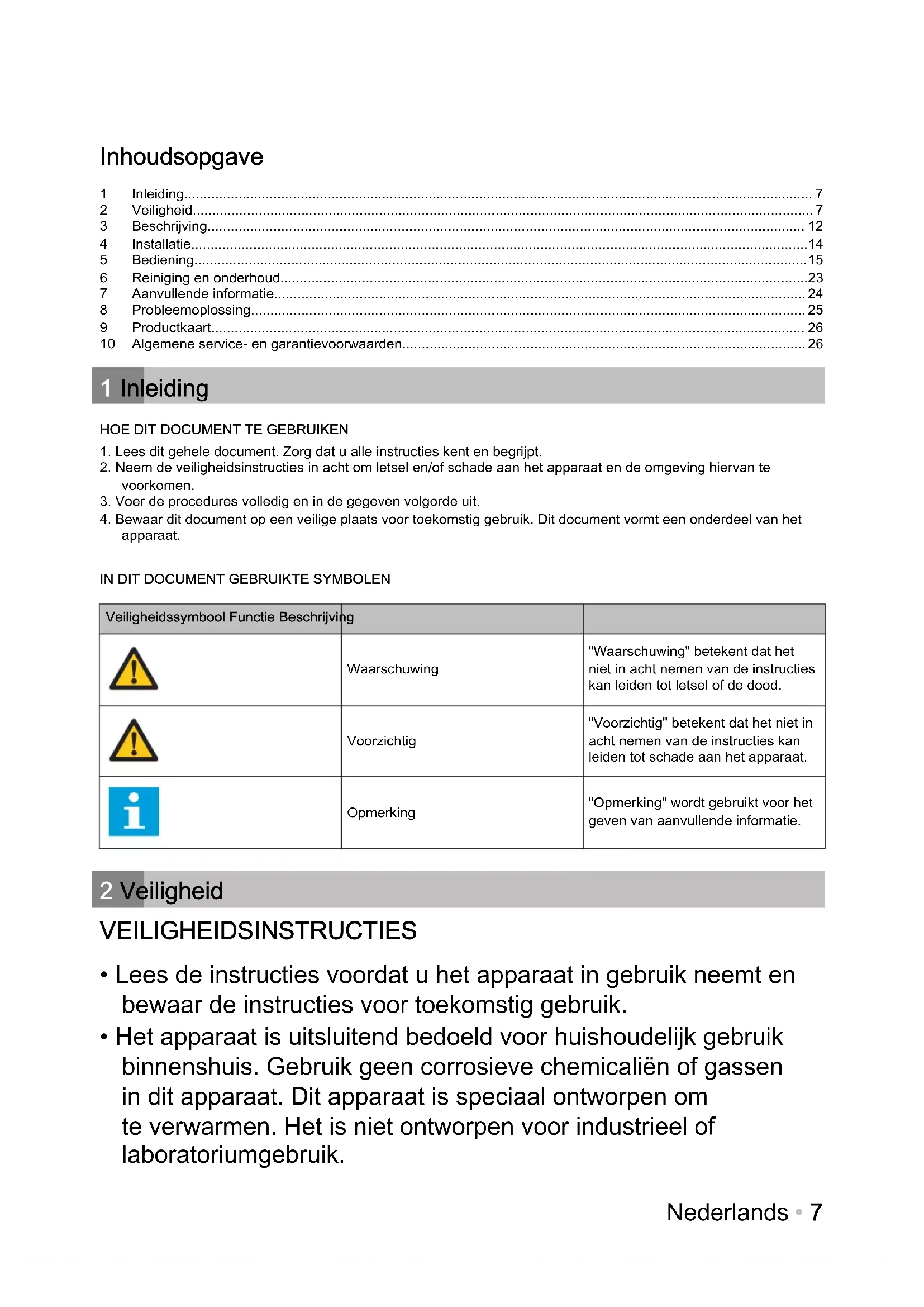 Veiligheidssymbool Functie Beschrijving Waarschuwing "Waarschuwing" betekent dat het niet in acht nemen van de instructies kan leiden tot letsel of de dood. Voorzichtig "Voorzichtig" betekent dat het niet in acht nemen van de instructies kan leiden tot schade aan het apparaat. Opmerking "Opmerking" wordt gebruikt voor het geven van aanvullende informatie. 2 Veiligheid VEILIGHEIDSINSTRUCTIES