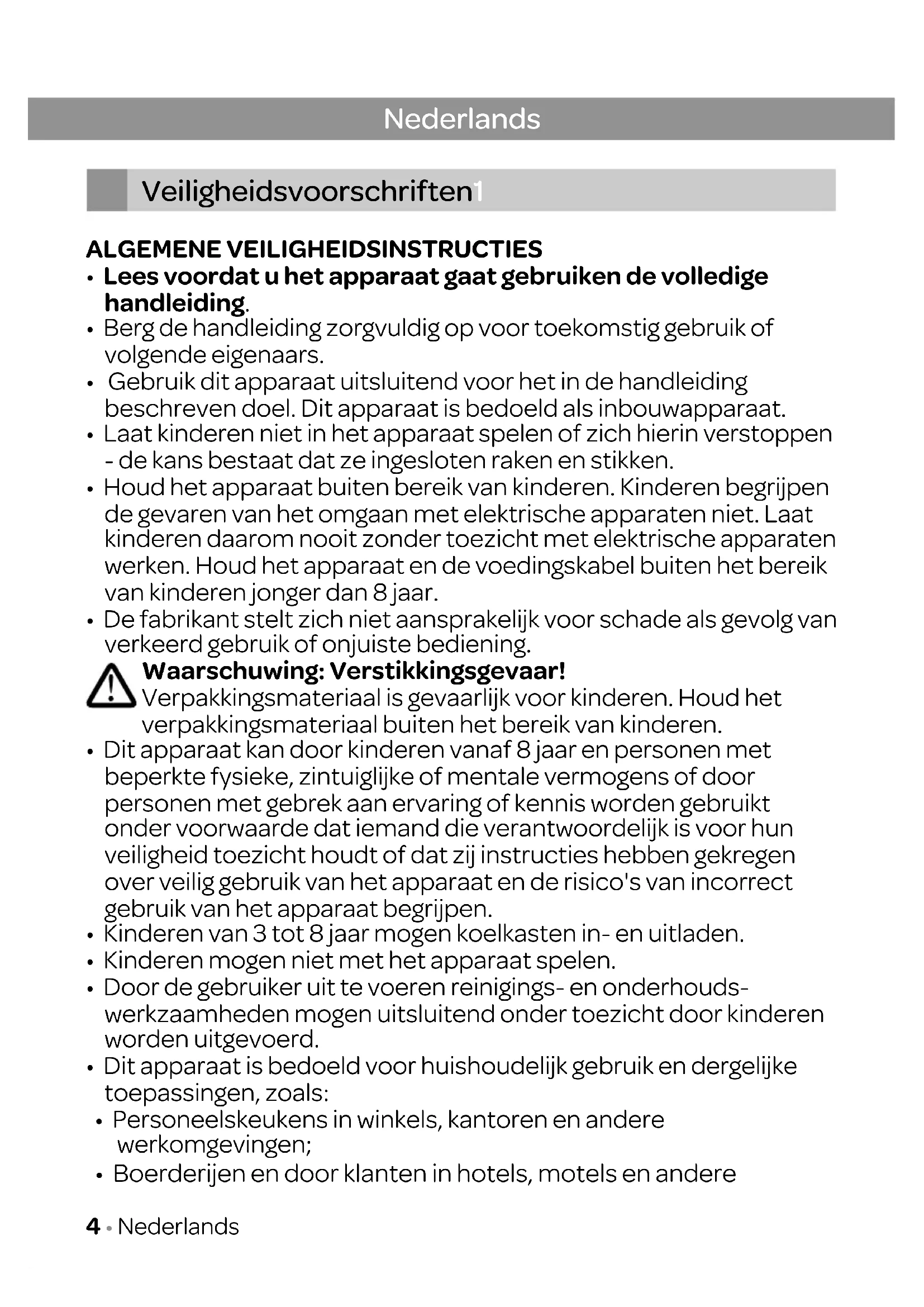 - Laat kinderen niet in het apparaat spelen of zich hierin verstoppen - de kans bestaat dat ze ingesloten raken en stikken.