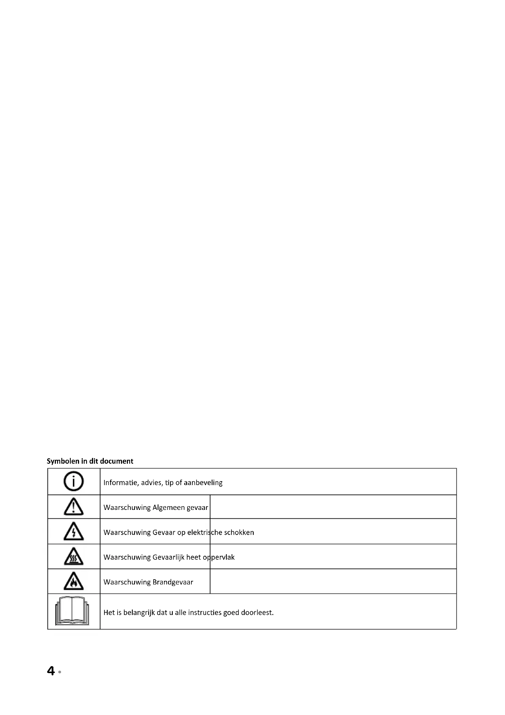 Informae, advies, p of aanbeveling Waarschuwing Algemeen gevaar Waarschuwing Gevaar op elektrische schokken Waarschuwing Gevaarlijk heet oppervlak Waarschuwing Brandgevaar Het is belangrijk dat u alle instruces goed doorleest.Nederlands • 5 Nederlands veiligheidsvoorschriften1