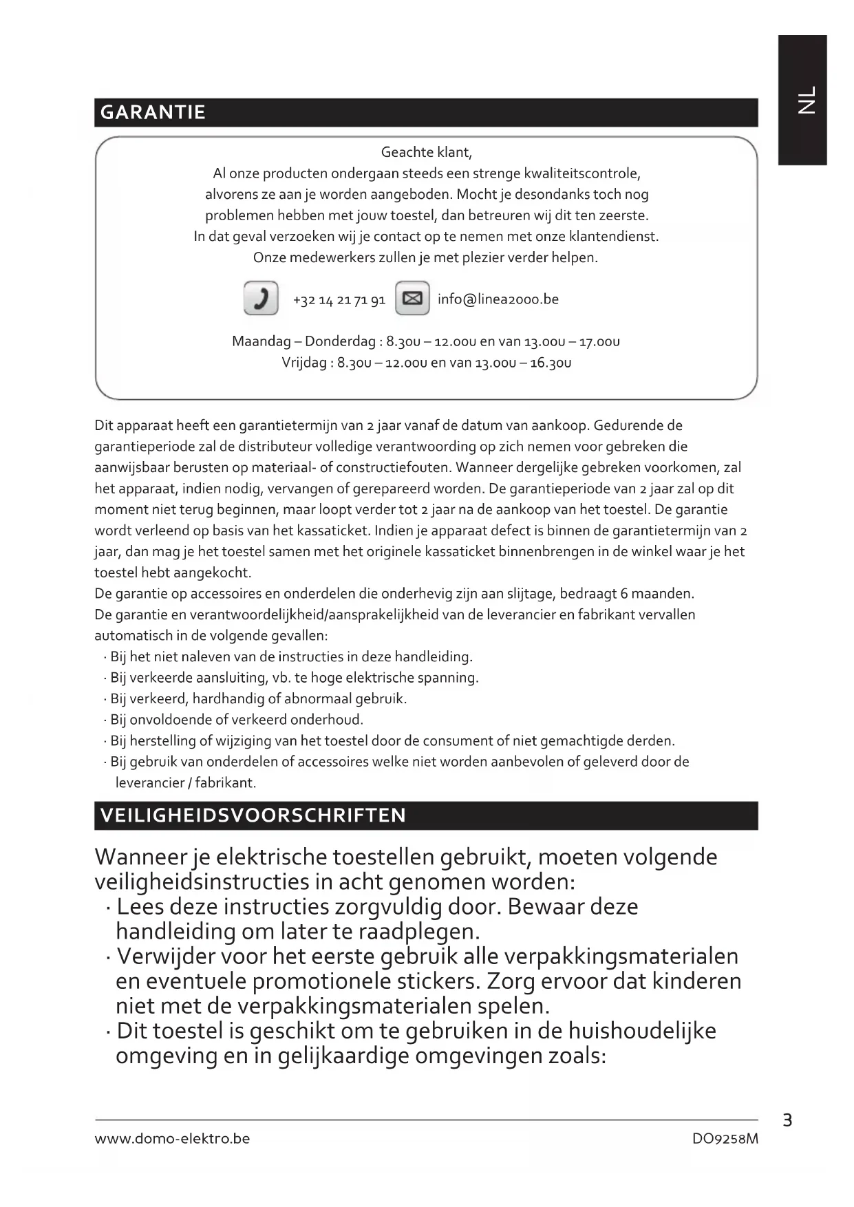 GARANTIE Geachte klant, Al onze producten ondergaan steeds een strenge kwaliteitscontrole, alvorens ze aan je worden aangeboden. Mocht je desondanks toch nog problemen hebben met jouw toestel, dan betreuren wij dit ten zeerste. In dat geval verzoeken wij je contact op te nemen met onze klantendienst. Onze medewerkers zullen je met plezier verder helpen. +32 14 21 71 91 info@linea2000.be Maandag – Donderdag : 8.30u – 12.00u en van 13.00u – 17.00u Vrijdag : 8.30u – 12.00u en van 13.00u – 16.30u Dit apparaat heeft een garantietermijn van 2 jaar vanaf de datum van aankoop. Gedurende de garantieperiode zal de distributeur volledige verantwoording op zich nemen voor gebreken die aanwijsbaar berusten op materiaal- of constructiefouten. Wanneer dergelijke gebreken voorkomen, zal het apparaat, indien nodig, vervangen of gerepareerd worden. De garantieperiode van 2 jaar zal op dit moment niet terug beginnen, maar loopt verder tot 2 jaar na de aankoop van het toestel. De garantie wordt verleend op basis van het kassaticket. Indien je apparaat defect is binnen de garantietermijn van 2 jaar, dan mag je het toestel samen met het originele kassaticket binnenbrengen in de winkel waar je het toestel hebt aangekocht. De garantie op accessoires en onderdelen die onderhevig zijn aan slijtage, bedraagt 6 maanden. De garantie en verantwoordelijkheid/aansprakelijkheid van de leverancier en fabrikant vervallen automatisch in de volgende gevallen: