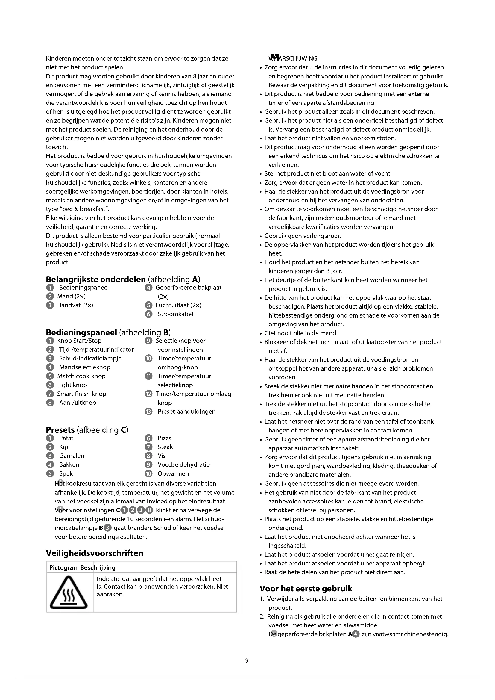 gaat branden. Schud of keer het voedsel voor betere bereidingsresultaten. Veiligheidsvoorschriften Pictogram Beschrijving Indicatie dat aangeeft dat het oppervlak heet is. Contact kan brandwonden veroorzaken. Niet aanraken.10 Afdanking Het product is bestemd voor gescheiden inzameling bij een hiertoe aangewezen verzamelpunt. Werp het product niet weg bij het huishoudelijk afval.Neem voor meer informatie contact op met de detailhandelaar of de lokale overheid die verantwoordelijk is voor het afvalbeheer.