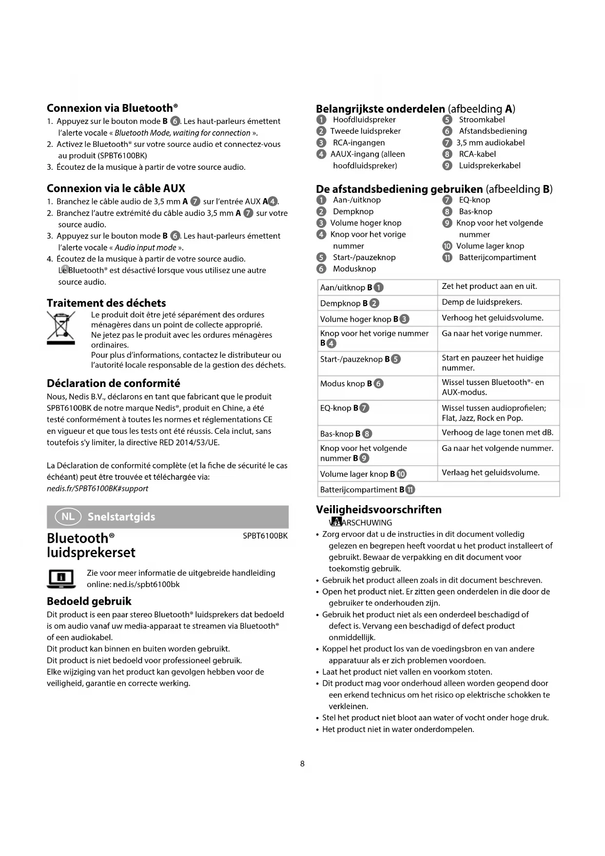 in uw audiobron.3. Druk op de modusknop B . De luidsprekers laten de gesproken waarschuwing horen: “Audio input mode” (modus audio-ingang).4. Muziek afspelen van uw audiobron. Wanneer u een andere audiobron gebruikt, wordt Bluetooth® uitgeschakeld. Afdanking Het product is bestemd voor gescheiden inzameling bij een hiertoe aangewezen verzamelpunt. Werp het product niet weg bij het huishoudelijk afval.Neem voor meer informatie contact op met de detailhandelaar of de lokale overheid die verantwoordelijk is voor het afvalbeheer. Verklaring van overeenstemming Wij, Nedis B.V. verklaren als fabrikant dat het product SPBT6100BK van ons merk Nedis®, geproduceerd in China, is getest conform alle relevante CE-normen en voorschriften en dat alle tests met succes zijn doorstaan. Dit omvat, maar is niet beperkt tot de richtlijn RED 2014/53/EU.De volledige conformiteitsverklaring (en het blad met veiligheidsgegevens indien van toepassing) kan worden gevonden en gedownload via:nedis.nl/SPBT6100BK#support