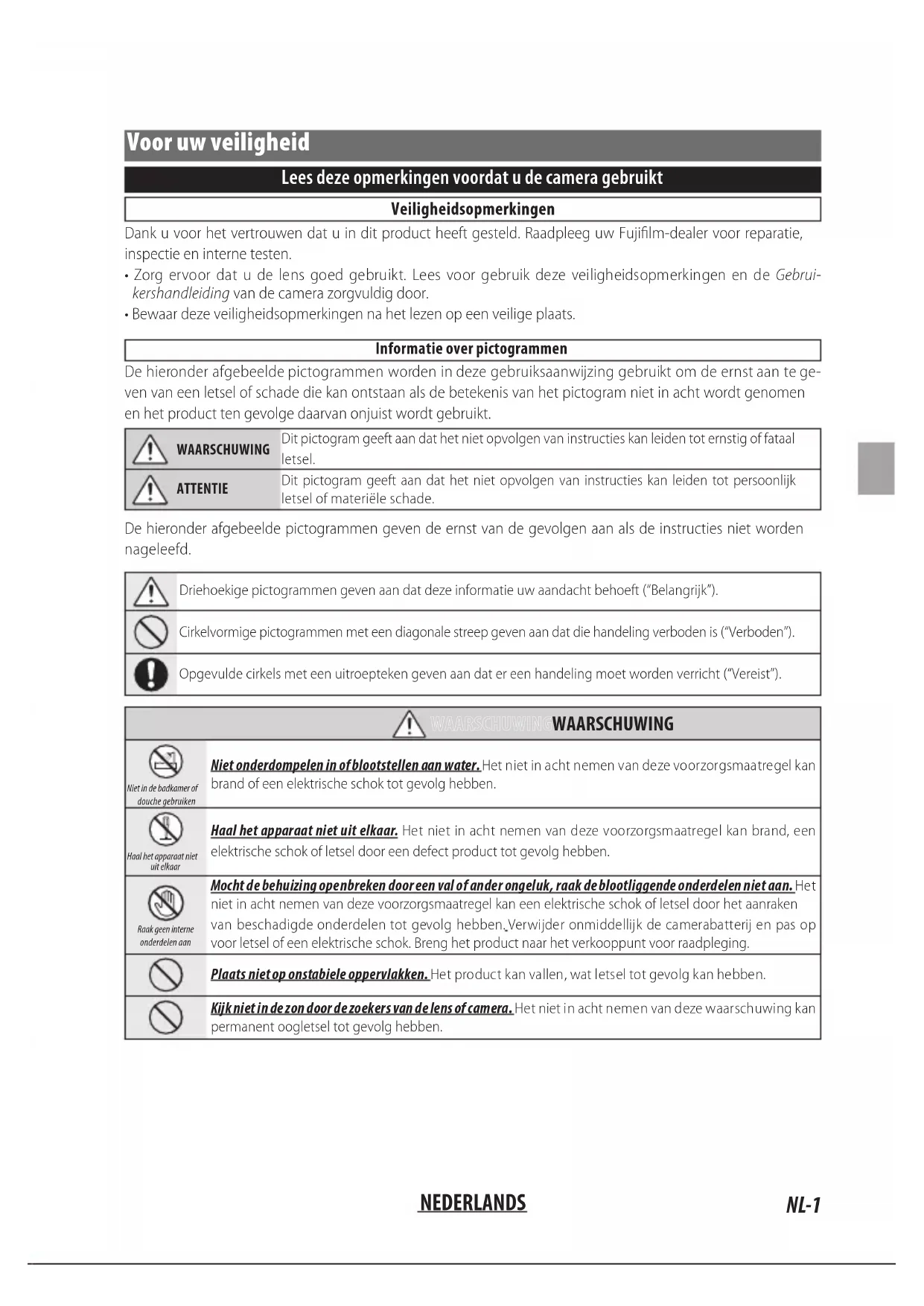- Al disparar con un obturador electrónico de cortinilla delantera, puede producirse una exposición desigual en la imagen capturada. Se recomienda disparar con un obturador mecánico.NL-1 NEDERLANDS Voor uw veiligheid Lees deze opmerkingen voordat u de camera gebruikt Veiligheidsopmerkingen Dank u voor het vertrouwen dat u in dit product heeft gesteld. Raadpleeg uw Fujifilm-dealer voor reparatie, inspectie en interne testen.