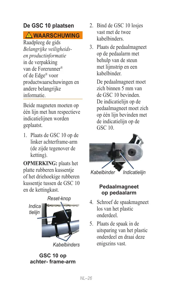 2. Bind de GSC 10 losjes vast met de twee kabelbinders. 3. Plaats de pedaalmagneet op de pedaalarm met behulp van de steun met lijmstrip en een kabelbinder. De pedaalmagneet moet zich binnen 5 mm van de GSC 10 bevinden. De indicatielijn op de pedaalmagneet moet zich op één lijn bevinden met de indicatielijn op de GSC 10.
