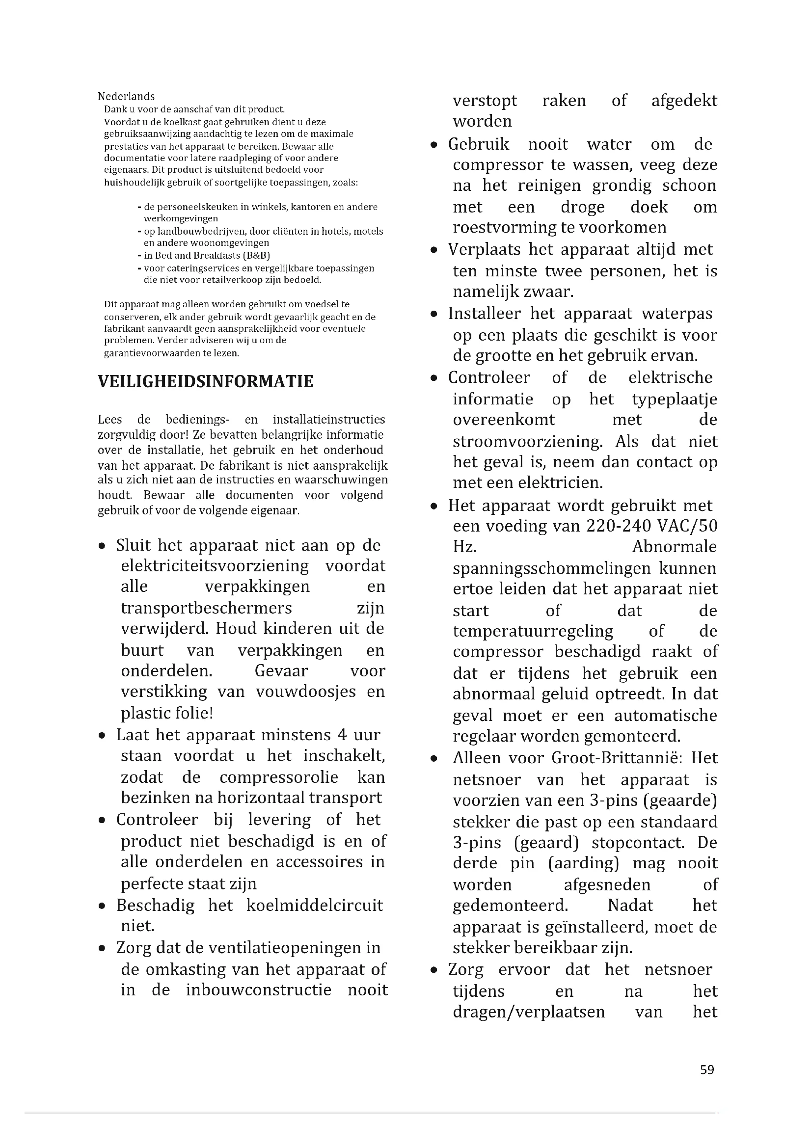 Para mais informações sobre o produto, consulte https://eprel.ec.europa.eu/ ou digitalize o QR na etiqueta de energia fornecida com o aparelho59 Nederlands Dank u voor de aanschaf van dit product. Voordat u de koelkast gaat gebruiken dient u deze gebruiksaanwijzing aandachtig te lezen om de maximale prestaties van het apparaat te bereiken. Bewaar alle documentatie voor latere raadpleging of voor andere eigenaars. Dit product is uitsluitend bedoeld voor huishoudelijk gebruik of soortgelijke toepassingen, zoals: - de personeelskeuken in winkels, kantoren en andere werkomgevingen - op landbouwbedrijven, door cliënten in hotels, motels en andere woonomgevingen - in Bed and Breakfasts (B&B) - voor cateringservices en vergelijkbare toepassingen die niet voor retailverkoop zijn bedoeld. Dit apparaat mag alleen worden gebruikt om voedsel te conserveren, elk ander gebruik wordt gevaarlijk geacht en de fabrikant aanvaardt geen aansprakelijkheid voor eventuele problemen. Verder adviseren wij u om de garantievoorwaarden te lezen. VEILIGHEIDSINFORMATIE Lees de bedienings- en installatieinstructies zorgvuldig door! Ze bevatten belangrijke informatie over de installatie, het gebruik en het onderhoud van het apparaat. De fabrikant is niet aansprakelijk als u zich niet aan de instructies en waarschuwingen houdt. Bewaar alle documenten voor volgend gebruik of voor de volgende eigenaar.