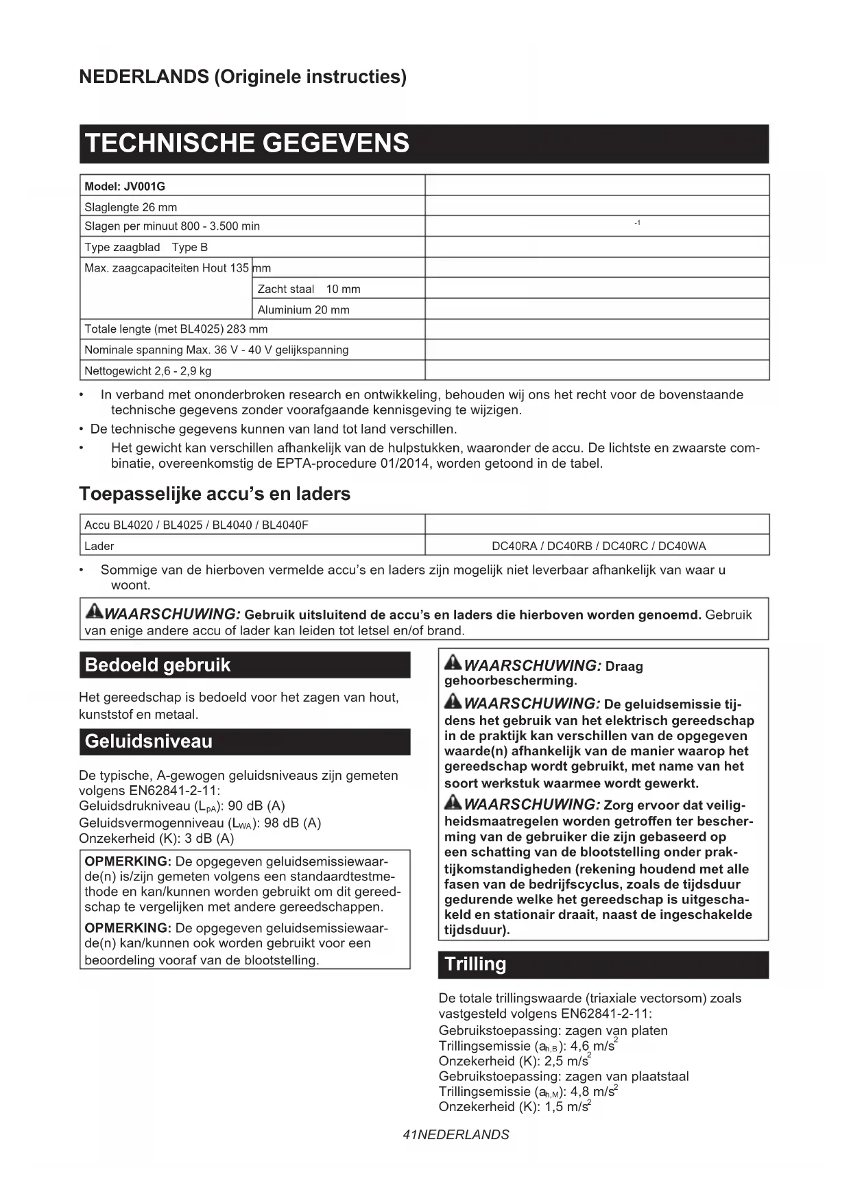 - Sommigevandehierbovenvermeldeaccu’senladerszijnmogelijknietleverbaarafhankelijkvanwaaru woont. WAARSCHUWING: Gebruik uitsluitend de accu’s en laders die hierboven worden genoemd.Gebruik vanenigeandereaccuofladerkanleidentotletselen/ofbrand. Bedoeld gebruik Hetgereedschapisbedoeldvoorhetzagenvanhout, kunststof en metaal. Geluidsniveau Detypische,A-gewogengeluidsniveauszijngemeten volgensEN62841-2-11: Geluidsdrukniveau (L