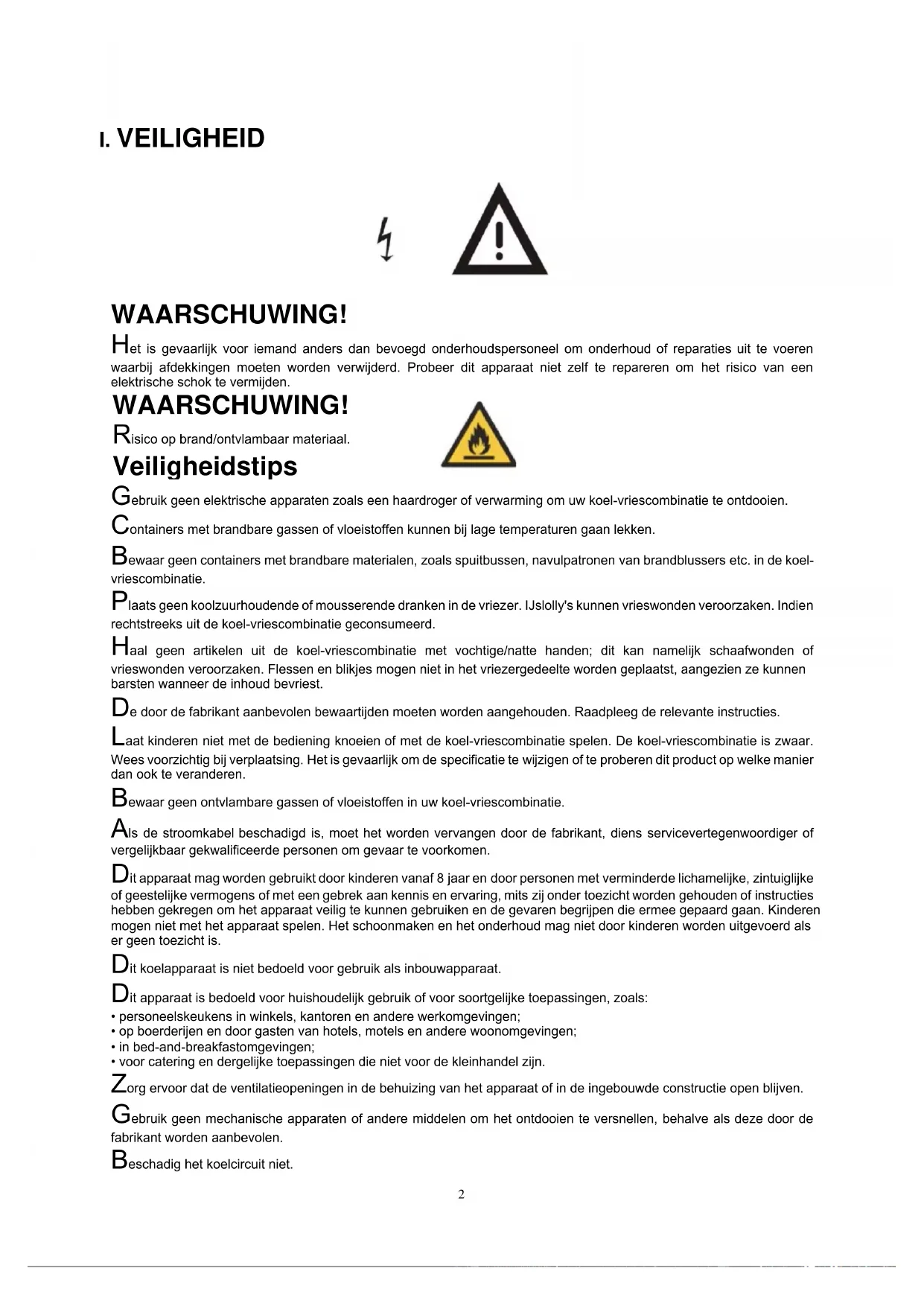 WAARSCHUWING! Het is gevaarlijk voor iemand anders dan bevoegd onderhoudspersoneel om onderhoud of reparaties uit te voeren waarbij afdekkingen moeten worden verwijderd. Probeer dit apparaat niet zelf te repareren om het risico van een elektrische schok te vermijden. WAARSCHUWING! Risico op brand/ontvlambaar materiaal. Veiligheidstips Gebruik geen elektrische apparaten zoals een haardroger of verwarming om uw koel-vriescombinatie te ontdooien. Containers met brandbare gassen of vloeistoffen kunnen bij lage temperaturen gaan lekken. Bewaar geen containers met brandbare materialen, zoals spuitbussen, navulpatronen van brandblussers etc. in de koel- vriescombinatie. Plaats geen koolzuurhoudende of mousserende dranken in de vriezer. IJslolly's kunnen vrieswonden veroorzaken. Indien rechtstreeks uit de koel-vriescombinatie geconsumeerd. Haal geen artikelen uit de koel-vriescombinatie met vochtige/natte handen; dit kan namelijk schaafwonden of vrieswonden veroorzaken. Flessen en blikjes mogen niet in het vriezergedeelte worden geplaatst, aangezien ze kunnen barsten wanneer de inhoud bevriest. De door de fabrikant aanbevolen bewaartijden moeten worden aangehouden. Raadpleeg de relevante instructies. Laat kinderen niet met de bediening knoeien of met de koel-vriescombinatie spelen. De koel-vriescombinatie is zwaar. Wees voorzichtig bij verplaatsing. Het is gevaarlijk om de specificatie te wijzigen of te proberen dit product op welke manier dan ook te veranderen. Bewaar geen ontvlambare gassen of vloeistoffen in uw koel-vriescombinatie. Als de stroomkabel beschadigd is, moet het worden vervangen door de fabrikant, diens servicevertegenwoordiger of vergelijkbaar gekwalificeerde personen om gevaar te voorkomen. Dit apparaat mag worden gebruikt door kinderen vanaf 8 jaar en door personen met verminderde lichamelijke, zintuiglijke of geestelijke vermogens of met een gebrek aan kennis en ervaring, mits zij onder toezicht worden gehouden of instructies hebben gekregen om het apparaat veilig te kunnen gebruiken en de gevaren begrijpen die ermee gepaard gaan. Kinderen mogen niet met het apparaat spelen. Het schoonmaken en het onderhoud mag niet door kinderen worden uitgevoerd als er geen toezicht is. Dit koelapparaat is niet bedoeld voor gebruik als inbouwapparaat. Dit apparaat is bedoeld voor huishoudelijk gebruik of voor soortgelijke toepassingen, zoals: