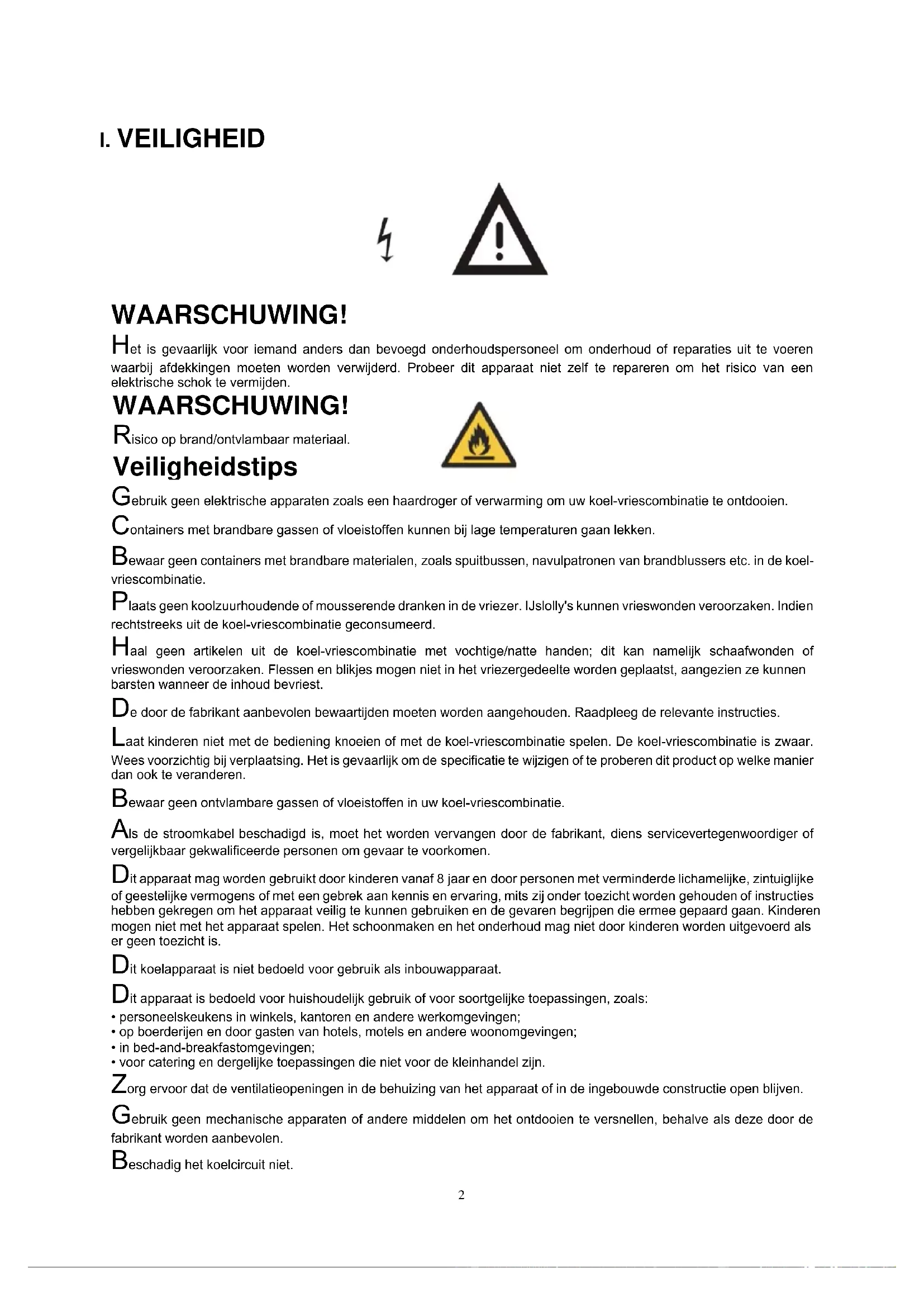WAARSCHUWING! Het is gevaarlijk voor iemand anders dan bevoegd onderhoudspersoneel om onderhoud of reparaties uit te voeren waarbij afdekkingen moeten worden verwijderd. Probeer dit apparaat niet zelf te repareren om het risico van een elektrische schok te vermijden. WAARSCHUWING! Risico op brand/ontvlambaar materiaal. Veiligheidstips Gebruik geen elektrische apparaten zoals een haardroger of verwarming om uw koel-vriescombinatie te ontdooien. Containers met brandbare gassen of vloeistoffen kunnen bij lage temperaturen gaan lekken. Bewaar geen containers met brandbare materialen, zoals spuitbussen, navulpatronen van brandblussers etc. in de koel- vriescombinatie. Plaats geen koolzuurhoudende of mousserende dranken in de vriezer. IJslolly's kunnen vrieswonden veroorzaken. Indien rechtstreeks uit de koel-vriescombinatie geconsumeerd. Haal geen artikelen uit de koel-vriescombinatie met vochtige/natte handen; dit kan namelijk schaafwonden of vrieswonden veroorzaken. Flessen en blikjes mogen niet in het vriezergedeelte worden geplaatst, aangezien ze kunnen barsten wanneer de inhoud bevriest. De door de fabrikant aanbevolen bewaartijden moeten worden aangehouden. Raadpleeg de relevante instructies. Laat kinderen niet met de bediening knoeien of met de koel-vriescombinatie spelen. De koel-vriescombinatie is zwaar. Wees voorzichtig bij verplaatsing. Het is gevaarlijk om de specificatie te wijzigen of te proberen dit product op welke manier dan ook te veranderen. Bewaar geen ontvlambare gassen of vloeistoffen in uw koel-vriescombinatie. Als de stroomkabel beschadigd is, moet het worden vervangen door de fabrikant, diens servicevertegenwoordiger of vergelijkbaar gekwalificeerde personen om gevaar te voorkomen. Dit apparaat mag worden gebruikt door kinderen vanaf 8 jaar en door personen met verminderde lichamelijke, zintuiglijke of geestelijke vermogens of met een gebrek aan kennis en ervaring, mits zij onder toezicht worden gehouden of instructies hebben gekregen om het apparaat veilig te kunnen gebruiken en de gevaren begrijpen die ermee gepaard gaan. Kinderen mogen niet met het apparaat spelen. Het schoonmaken en het onderhoud mag niet door kinderen worden uitgevoerd als er geen toezicht is. Dit koelapparaat is niet bedoeld voor gebruik als inbouwapparaat. Dit apparaat is bedoeld voor huishoudelijk gebruik of voor soortgelijke toepassingen, zoals: