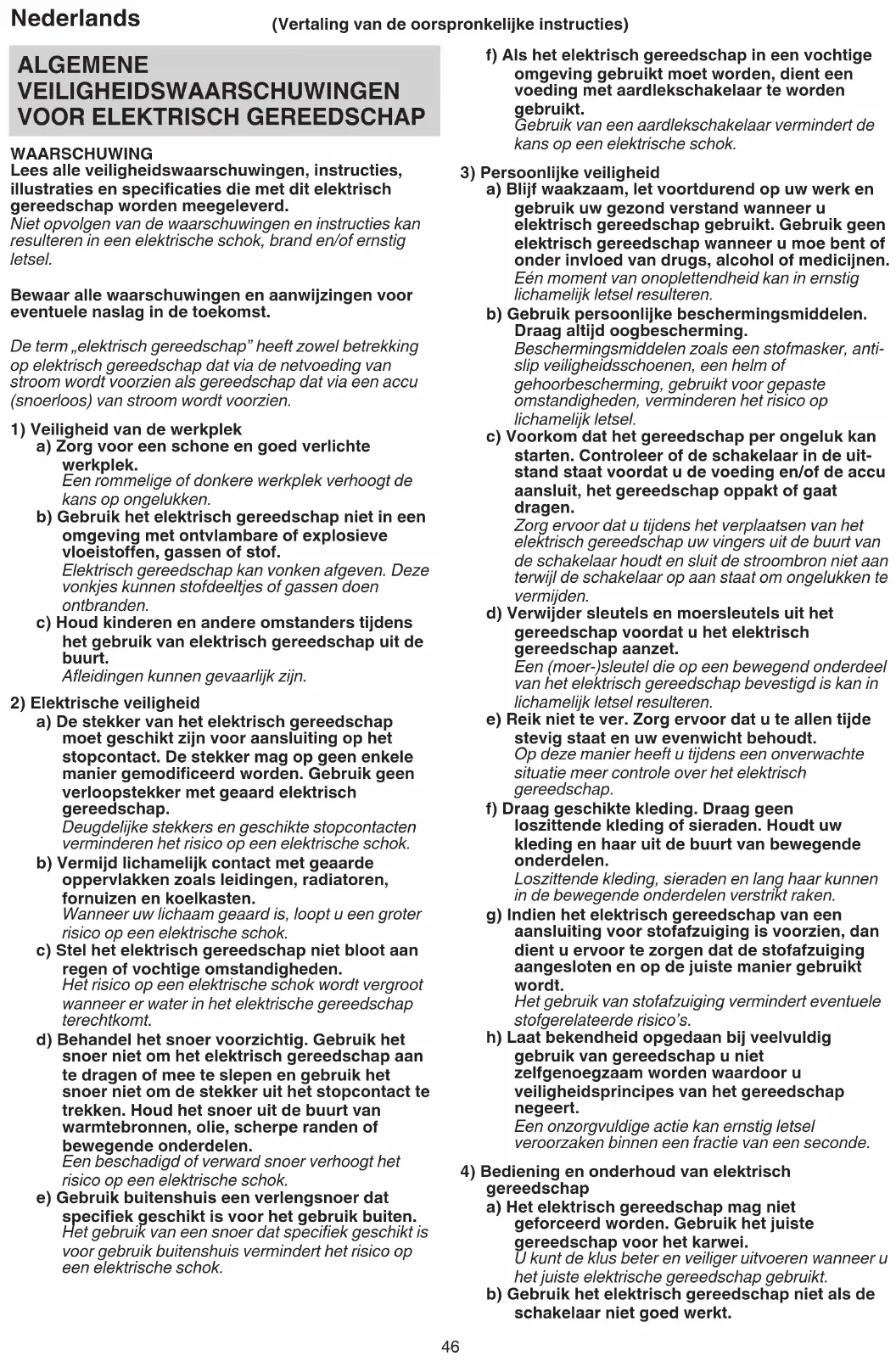 WAARSCHUWING Lees alle veiligheidswaarschuwingen, instructies, illustraties en specificaties die met dit elektrisch gereedschap worden meegeleverd. Niet opvolgen van de waarschuwingen en instructies kan resulteren in een elektrische schok, brand en/of ernstig letsel. Bewaar alle waarschuwingen en aanwijzingen voor eventuele naslag in de toekomst. De term „elektrisch gereedschap” heeft zowel betrekking op elektrisch gereedschap dat via de netvoeding van stroom wordt voorzien als gereedschap dat via een accu (snoerloos) van stroom wordt voorzien.