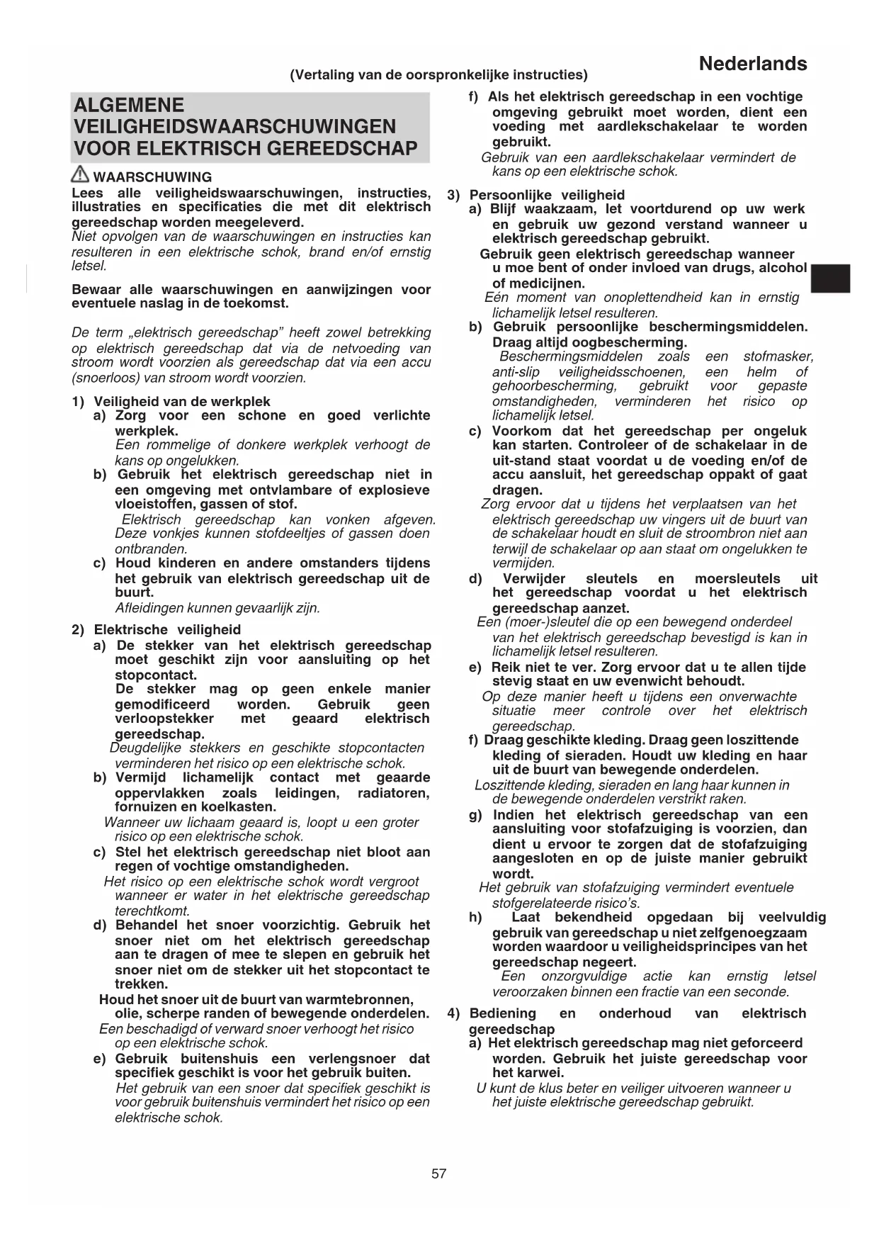 gereedschap a) Het elektrisch gereedschap mag niet geforceerd worden. Gebruik het juiste gereedschap voor het karwei. U kunt de klus beter en veiliger uitvoeren wanneer u het juiste elektrische gereedschap gebruikt. ALGEMENE VEILIGHEIDSWAARSCHUWINGEN