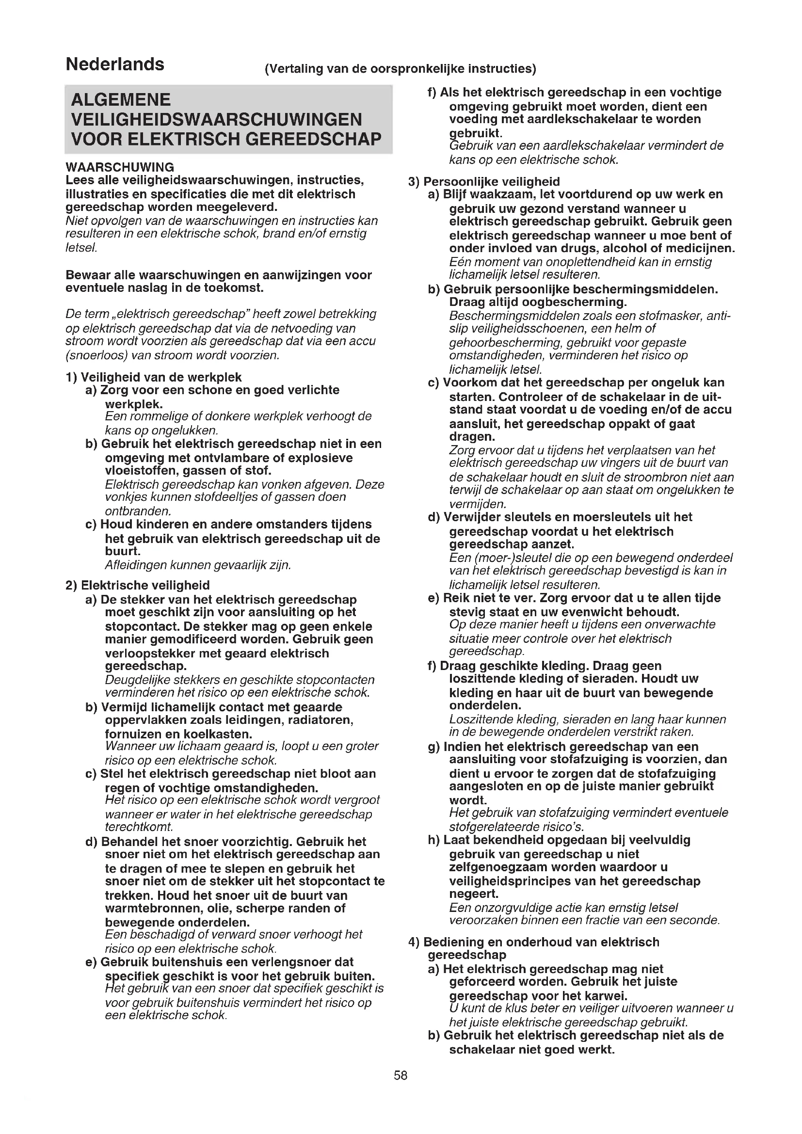 a) Zorg voor een schone en goed verlichte werkplek. Een rommelige of donkere werkplek verhoogt de kans op ongelukken. b) Gebruik het elektrisch gereedschap niet in een omgeving met ontvlambare of explosieve vloeistoffen, gassen of stof. Elektrisch gereedschap kan vonken afgeven. Deze vonkjes kunnen stofdeeltjes of gassen doen ontbranden. c) Houd kinderen en andere omstanders tijdens het gebruik van elektrisch gereedschap uit de buurt. Afleidingen kunnen gevaarlijk zijn.