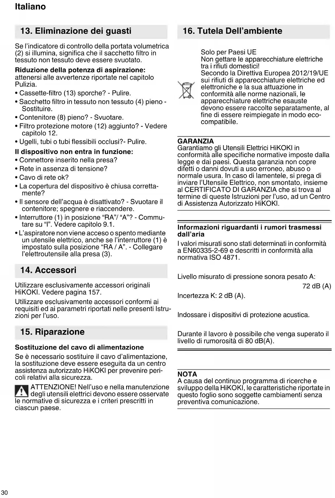 Solo per Paesi UE Non gettare le apparecchiature elettriche tra i rifiuti domestici! Secondo la Direttiva Europea 2012/19/UE sui rifiuti di apparecchiature elettriche ed elettroniche e la sua attuazione in conformità alle norme nazionali, le apparecchiature elettriche esauste devono essere raccolte separatamente, al fine di essere reimpiegate in modo eco- compatibile. GARANZIA Garantiamo gli Utensili Elettrici HiKOKI in conformità alle specifiche normative imposte dalla legge e dai paesi. Questa garanzia non copre difetti o danni dovuti a uso erroneo, abuso o normale usura. In caso di lamentele, si prega di inviare l’Utensile Elettrico, non smontato, insieme al CERTIFICATO DI GARANZIA che si trova al termine di queste Istruzioni per l’uso, ad un Centro di Assistenza Autorizzato HiKOKI. Informazioni riguardanti i rumori trasmessi dall’aria I valori misurati sono stati determinati in conformità a EN60335-2-69 e descritti in conformità alla normativa ISO 4871. Livello misurato di pressione sonora pesato A: 72 dB (A) Incertezza K: 2 dB (A). Indossare i dispositivi di protezione acustica. Durante il lavoro è possibile che venga superato il livello di rumorosità di 80 dB(A). NOTA A causa del continuo programma di ricerche e sviluppo della HiKOKI, le caratteristiche riportate in questo foglio sono soggette cambiamenti senza preventiva comunicazione. RP250YBL_C99749871_305.book 30 ページ 2023年4月6日 木曜日 午後12時6分31 Nederlands Vertaling van de oorspronkelijke aanwijzingen De nat-droog-stofzuiger is geschikt voor het opzuigen van stof, vaste materialen (glas- scherven, spijkers, enz.), allerlei soorten vloei- stoffen, met uitzondering van licht ontvlambare, brandbare vloeistoffen, en materiaal dat warmer is dan 60 °C. De nat-droog-stofzuiger is geschikt voor het scheiden van droge, niet-brandbare stof, niet- brandbare vloeistoffen, houtstof en gevaarlijke stof met grenswaarden op de werkplek groter dan 1 mg/m³. Dit apparaat is niet bestemd voor gebruik door personen met beperkte fysieke, sensorische of geestelijke capaciteiten of die gebrek aan ervaring en/of kennis hebben, tenzij zij onder toezicht staan van een persoon die verantwoordelijk is voor hun veiligheid of van hem of haar aanwijzingen hebben gekregen over het gebruik van het apparaat. Neem de voor het land specifieke voorschriften net zoals de informatie van de materiaalfabrikant in acht. Dit product is bestemd voor beroepsmatig gebruik. Er mogen geen stoffen die asbest bevatten worden opgezogen. Er mogen geen brandbare stoffen worden opge- zogen. Er mogen geen brandbare of explosieve oplosmid- delen, in oplosmiddel gedrenkt materiaal, explo- sieve stoffen, vloeistoffen, zoals benzine, olie of alcohol, verdunningsmiddelen of materiaal dat warmer is dan 60°C, worden opgezogen. Anders bestaat er explosie- en brandgevaar! Het apparaat mag niet in de buurt van ontvlambare gassen en substanties worden gebruikt. Voor schade door oneigenlijk gebruik is alleen de gebruiker aansprakelijk. De algemeen erkende veiligheidsvoorschriften en de bijgevoegde veiligheidsvoorschriften dienen te worden nageleefd. Lees vóór het gebruik van het apparaat de bijbehorende veiligheidsvoorschriften en de gebruiksaanwijzing aandachtig en volledig door. Bewaar alle docu- menten die bij het apparaat horen zorgvuldig en geef het apparaat alleen samen met deze docu- menten door aan anderen.