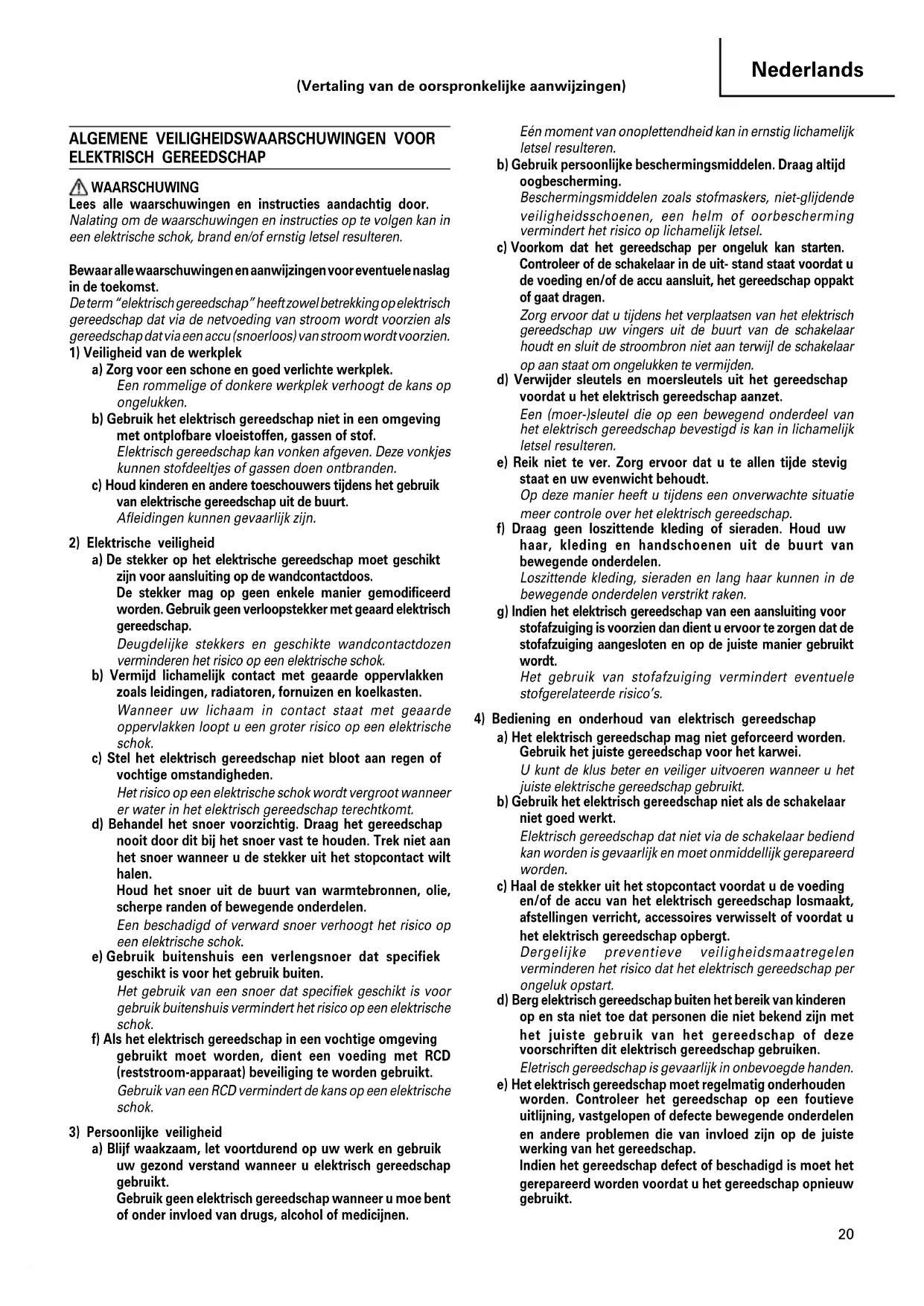 ELEKTRISCH GEREEDSCHAP WAARSCHUWING Lees alle waarschuwingen en instructies aandachtig door. Nalating om de waarschuwingen en instructies op te volgen kan in een elektrische schok, brand en/of ernstig letsel resulteren. Bewaar alle waarschuwingen en aanwijzingen voor eventuele naslag in de toekomst. De term “elektrisch gereedschap” heeft zowel betrekking op elektrisch gereedschap dat via de netvoeding van stroom wordt voorzien als gereedschap dat via een accu (snoerloos) van stroom wordt voorzien.