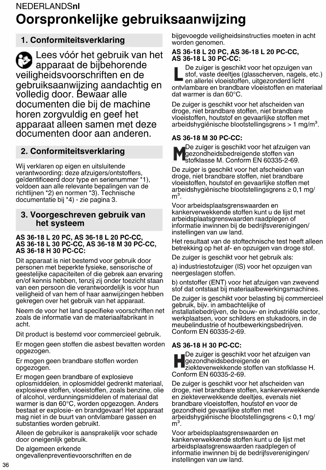 Oorspronkelijke gebruiksaanwijzing Lees vóór het gebruik van het apparaat de bijbehorende veiligheidsvoorschriften en de gebruiksaanwijzing aandachtig en volledig door. Bewaar alle documenten die bij de machine horen zorgvuldig en geef het apparaat alleen samen met deze documenten door aan anderen. Wij verklaren op eigen en uitsluitende verantwoording: deze afzuigers/ontstoffers, geïdentificeerd door type en serienummer *1), voldoen aan alle relevante bepalingen van de richtlijnen *2) en normen *3). Technische documentatie bij *4) - zie pagina 3. AS 36-18 L 20 PC, AS 36-18 L 20 PC-CC, AS 36-18 L 30 PC-CC, AS 36-18 M 30 PC-CC, AS 36-18 H 30 PC-CC: Dit apparaat is niet bestemd voor gebruik door personen met beperkte fysieke, sensorische of geestelijke capaciteiten of die gebrek aan ervaring en/of kennis hebben, tenzij zij onder toezicht staan van een persoon die verantwoordelijk is voor hun veiligheid of van hem of haar aanwijzingen hebben gekregen over het gebruik van het apparaat. Neem de voor het land specifieke voorschriften net zoals de informatie van de materiaalfabrikant in acht. Dit product is bestemd voor commercieel gebruik. Er mogen geen stoffen die asbest bevatten worden opgezogen. Er mogen geen brandbare stoffen worden opgezogen. Er mogen geen brandbare of explosieve oplosmiddelen, in oplosmiddel gedrenkt materiaal, explosieve stoffen, vloeistoffen, zoals benzine, olie of alcohol, verdunningsmiddelen of materiaal dat warmer is dan 60°C, worden opgezogen. Anders bestaat er explosie- en brandgevaar! Het apparaat mag niet in de buurt van ontvlambare gassen en substanties worden gebruikt. Alleen de gebruiker is aansprakelijk voor schade door oneigenlijk gebruik. De algemeen erkende ongevallenpreventievoorschriften en de bijgevoegde veiligheidsinstructies moeten in acht worden genomen. AS 36-18 L 20 PC, AS 36-18 L 20 PC-CC, AS 36-18 L 30 PC-CC: De zuiger is geschikt voor het opzuigen van stof, vaste deeltjes (glasscherven, nagels, etc.) en allerlei vloeistoffen, uitgezonderd licht ontvlambare en brandbare vloeistoffen en materiaal dat warmer is dan 60°C. De zuiger is geschikt voor het afscheiden van droge, niet brandbare stoffen, niet brandbare vloeistoffen, houtstof en gevaarlijke stoffen met arbeidshygiënische blootstellingsgrens > 1 mg/m³. AS 36-18 M 30 PC-CC: De zuiger is geschikt voor het afzuigen van gezondheidsbedreigende stoffen van stofklasse M. Conform EN 60335-2-69. De zuiger is geschikt voor het afscheiden van droge, niet brandbare stoffen, niet brandbare vloeistoffen, houtstof en gevaarlijke stoffen met arbeidshygiënische blootstellingsgrens ≥ 0,1 mg/ m³. Voor arbeidsplaatsgrenswaarden en kankerverwekkende stoffen kunt u de lijst met arbeidsplaatsgrenswaarden raadplegen of informatie inwinnen bij de bedrijfsverenigingen/ instellingen van uw land. Het resultaat van de stoftechnische test heeft alleen betrekking op het af- en opzuigen van droge stof. De zuiger is geschikt voor het gebruik als: a) industriestofzuiger (IS) voor het opzuigen van neergeslagen stoffen. b) ontstoffer (ENT) voor het afzuigen van zwevend stof dat ontstaat bij materiaalbewerkingsmachines. De zuiger is geschikt voor belasting bij commercieel gebruik, bijv. in ambachtelijke of installatiebedrijven, de bouw- en industriële sector, werkplaatsen, voor schilders en stukadoors, in de meubelindustrie of houtbewerkingsbedrijven. Conform EN 60335-2-69. AS 36-18 H 30 PC-CC: De zuiger is geschikt voor het afzuigen van gezondheidsbedreigende en ziekteverwekkende stoffen van stofklasse H. Conform EN 60335-2-69. De zuiger is geschikt voor het afscheiden van droge, niet brandbare stoffen, kankerverwekkende en ziekteverwekkende deeltjes, evenals niet brandbare vloeistoffen, houtstof en voor de gezondheid gevaarlijke stoffen met arbeidshygiënische blootstellingsgrens < 0,1 mg/ m³. Voor arbeidsplaatsgrenswaarden en kankerverwekkende stoffen kunt u de lijst met arbeidsplaatsgrenswaarden raadplegen of informatie inwinnen bij de bedrijfsverenigingen/ instellingen van uw land.