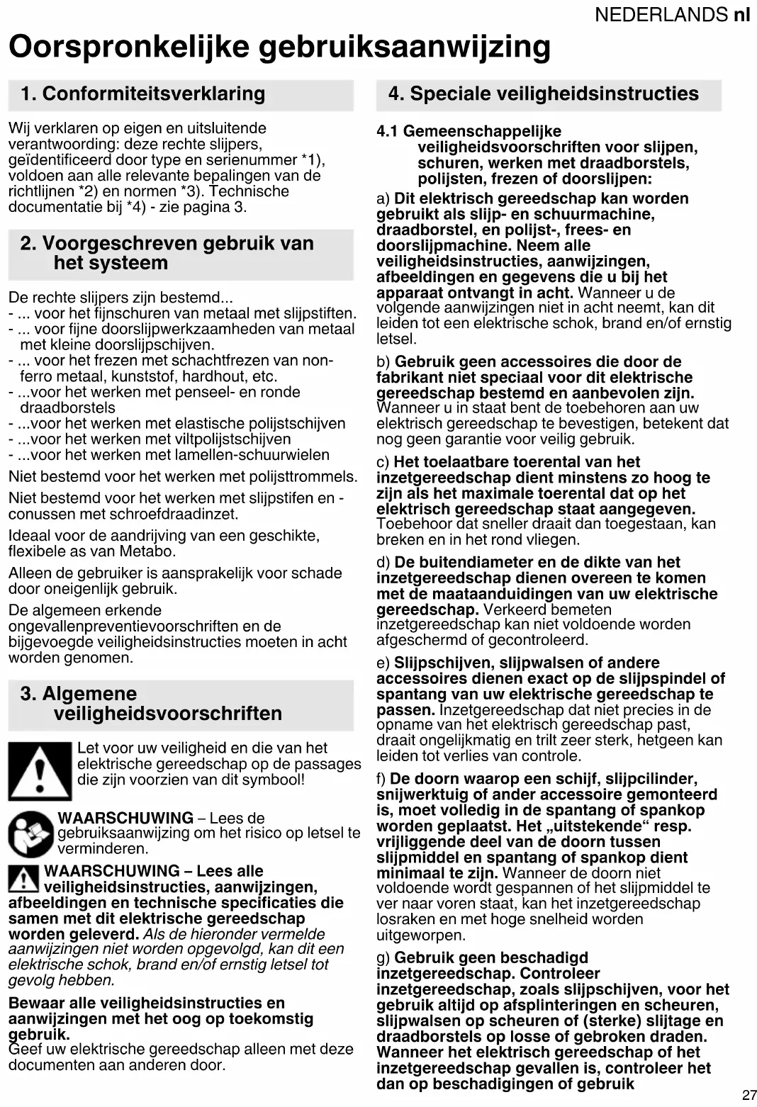 Oorspronkelijke gebruiksaanwijzing Wij verklaren op eigen en uitsluitende verantwoording: deze rechte slijpers, geïdentificeerd door type en serienummer *1), voldoen aan alle relevante bepalingen van de richtlijnen *2) en normen *3). Technische documentatie bij *4) - zie pagina 3. De rechte slijpers zijn bestemd... - ... voor het fijnschuren van metaal met slijpstiften. - ... voor fijne doorslijpwerkzaamheden van metaal met kleine doorslijpschijven. - ... voor het frezen met schachtfrezen van non- ferro metaal, kunststof, hardhout, etc. - ...voor het werken met penseel- en ronde draadborstels - ...voor het werken met elastische polijstschijven - ...voor het werken met viltpolijstschijven - ...voor het werken met lamellen-schuurwielen Niet bestemd voor het werken met polijsttrommels. Niet bestemd voor het werken met slijpstifen en - conussen met schroefdraadinzet. Ideaal voor de aandrijving van een geschikte, flexibele as van Metabo. Alleen de gebruiker is aansprakelijk voor schade door oneigenlijk gebruik. De algemeen erkende ongevallenpreventievoorschriften en de bijgevoegde veiligheidsinstructies moeten in acht worden genomen. Let voor uw veiligheid en die van het elektrische gereedschap op de passages die zijn voorzien van dit symbool! WAARSCHUWING – Lees de gebruiksaanwijzing om het risico op letsel te verminderen. WAARSCHUWING – Lees alle veiligheidsinstructies, aanwijzingen, afbeeldingen en technische specificaties die samen met dit elektrische gereedschap worden geleverd. Als de hieronder vermelde aanwijzingen niet worden opgevolgd, kan dit een elektrische schok, brand en/of ernstig letsel tot gevolg hebben. Bewaar alle veiligheidsinstructies en aanwijzingen met het oog op toekomstig gebruik. Geef uw elektrische gereedschap alleen met deze documenten aan anderen door.